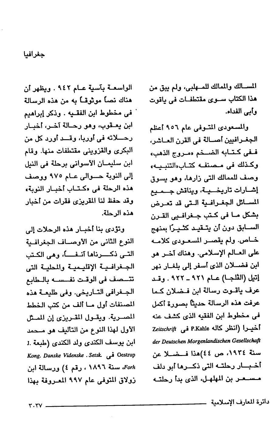 والمسعودى المتوفى عام 956 أعظم الجغرافيين أصالة في القرن العاشر، ففي كتابه الضخم "مروج الذهب" وكذلك في مصنفه كتاب "التنبيه" وصف للممالك التي زارها، وهو يسوق إشارات تاريخية، ويناقش جميع المسائل الجغرافية التي قد تعرض بشكل ما في كتب جغرافيى القرن السابق دون أن يتقيد كثيرًا بمنهج خاص. ولم يقصر المسعودي كلامه على العالم الإسلامي. وهناك آخر هو ابن فضلان الذي أسفر إلى بلغار نهر إتيل (الفلجا) عام 921 - 922. وقد عرف ياقوت رسالة ابن فضلان كما عرفت هذه الرسالة حديثًا بصورة أكمل في مخطوط ابن الفقيه الذي كشف عنه أخيرا (انظر كالة p.Kahle في Zeitschrift Morgenlandischen Gesellschafl der Deutschen سنة 1934, ص 44) هذا فضلا عن أخبار رحلته التي ذكرها أبو دلف مسعر بن المهلهل، الذي بدأ رحلته الواسعة بآسية عام 942. ويظهر أن هناك نصًّا موثوقًا به من هذه الرسالة في مخطوط ابن الفقيه. وذكر إبراهيم ابن يعقوب، وهو رحالة آخر، أخبار رحلاته في أوربا، وقد أورد كل من البكرى والقزوينى مقتطفات منها. وقام ابن سليمان الأسوانى برحلة في النيل إلى النوبة حوالي عام 975 ووصف هذه الرحلة في "كتاب أخبار النوبة" وقد حفظ لنا المقريزى فقرات من أخبار هذه الرحلة.