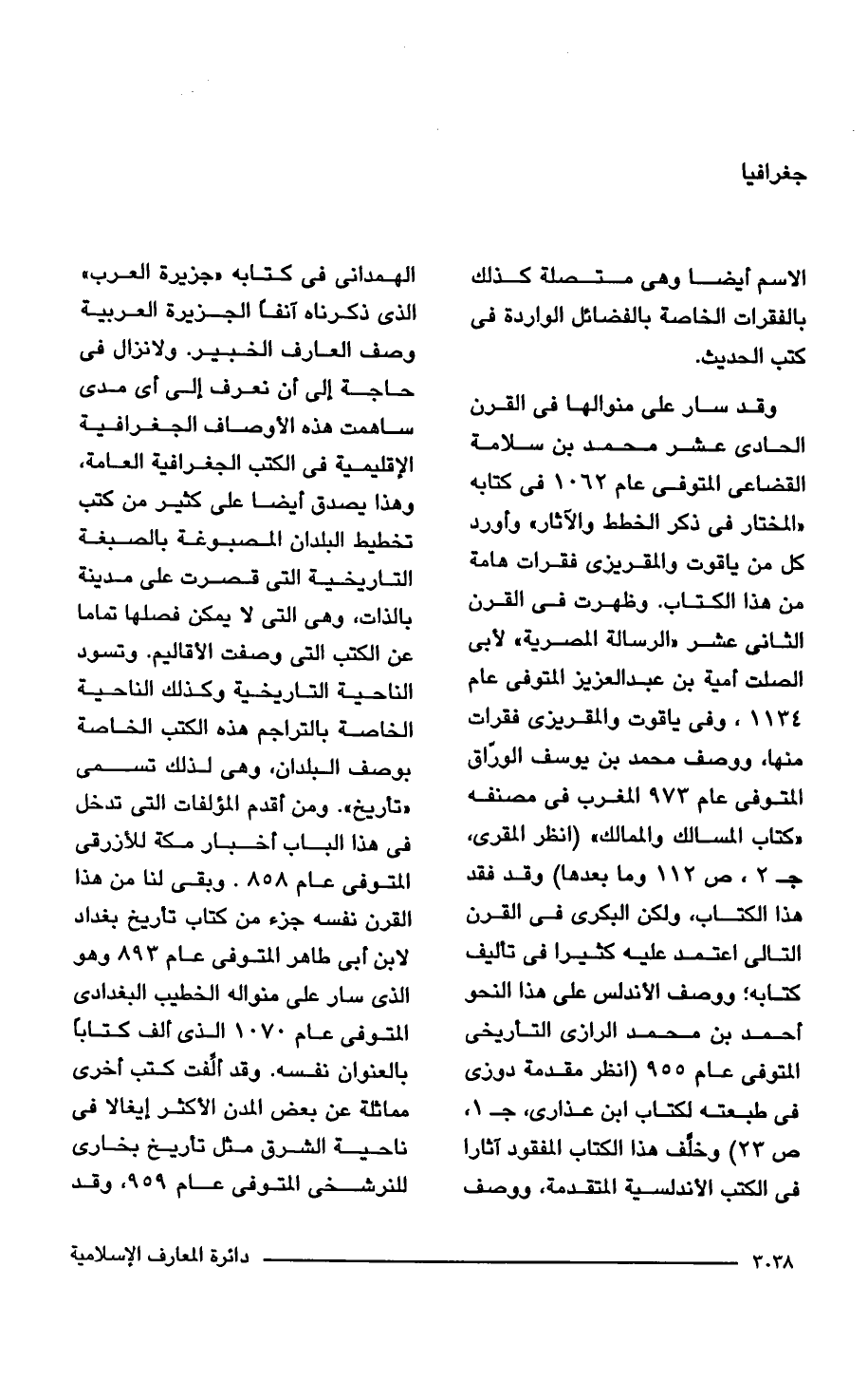وقد سار على منوالها في القرن الحادي عشر محمد بن سلامة القضاعى المتوفى 1062 في كتابه "المختار في ذكر الخطط والآثار" وأورد كل من ياقوت والمقريزى فقرات هامة من هذا الكتاب. وظهرت في القرن الثاني عشر "الرسالة المصرية" لأبي الصلت أمية بن عبد العزيز المتوفى عام 1134 وفي ياقوت والمقريزى فقرات منها، ووصف محمد بن يوسف الورّاق المتوفى عام 973 المغرب في مصنفه "كتاب المسالك والممالك" (انظر المقرى، جـ 2، ص 112 وما بعدها) وقد فقد هذا الكتاب، ولكن البكرى في القرن التالي اعتمد عليه كثيرا في تأليف كتابه؛ ووصف الأندلس على هذا النحو أحمد بن محمد الرازي التأريخى المتوفى عام 955 (انظر مقدمة دوزى في طبعته لكتاب ابن عذارى، جـ 1، ص 23) وخلَّف هذا الكتاب المفقود آثارا في الكتاب الأندلسية المتقدمة، ووصف الهمدانى في كتابه "جزيرة العرب" الذي ذكرناه آنفًا الجزيرة العربية وصف العارف الخبير. ولا نزال في حاجة إلى أن نعرف إلى أي مدي ساهمت هذه الأوصاف الجغرافية الإقليمية في الكتب الجغرافية العامة، وهذا يصدق أيضًا على كثير من كتب تخطيط البلدان المصبوغة بالصبغة التاريخية التي قصرت على مدينة بالذات، وهي التي لا يمكن فصلها تماما عن الكتبلتى وصفت الأقاليم. وتسود الناحية التاريخية وكذلك الناحية الخاصة بالتراجم هذه الكتب الخاصة بوصف البلدان، وهي لذلك تسمي "تأريخ". ومن أقدم المؤلفات التي تدخل في هذا الباب أخبار مكة للأزرقى المتوفى عام 858. وبقى لنا من هذا القرن ففسه جزء من كتاب تأريخ بغداد لابن أبي طاهر المتوفى عام 893 وهو الذي سار على منواله الخطيب البغدادي المتوفى عام 1070 الذي ألف كتابًا بالعنوان نفسه. وقد ألِّفت كتب أخرى مماثلة عن بعض المدن الأكثر إيغالا في ناحية الشرق مثل تأريخ بخارى للنرشخى المتوفى عام 959، وقد