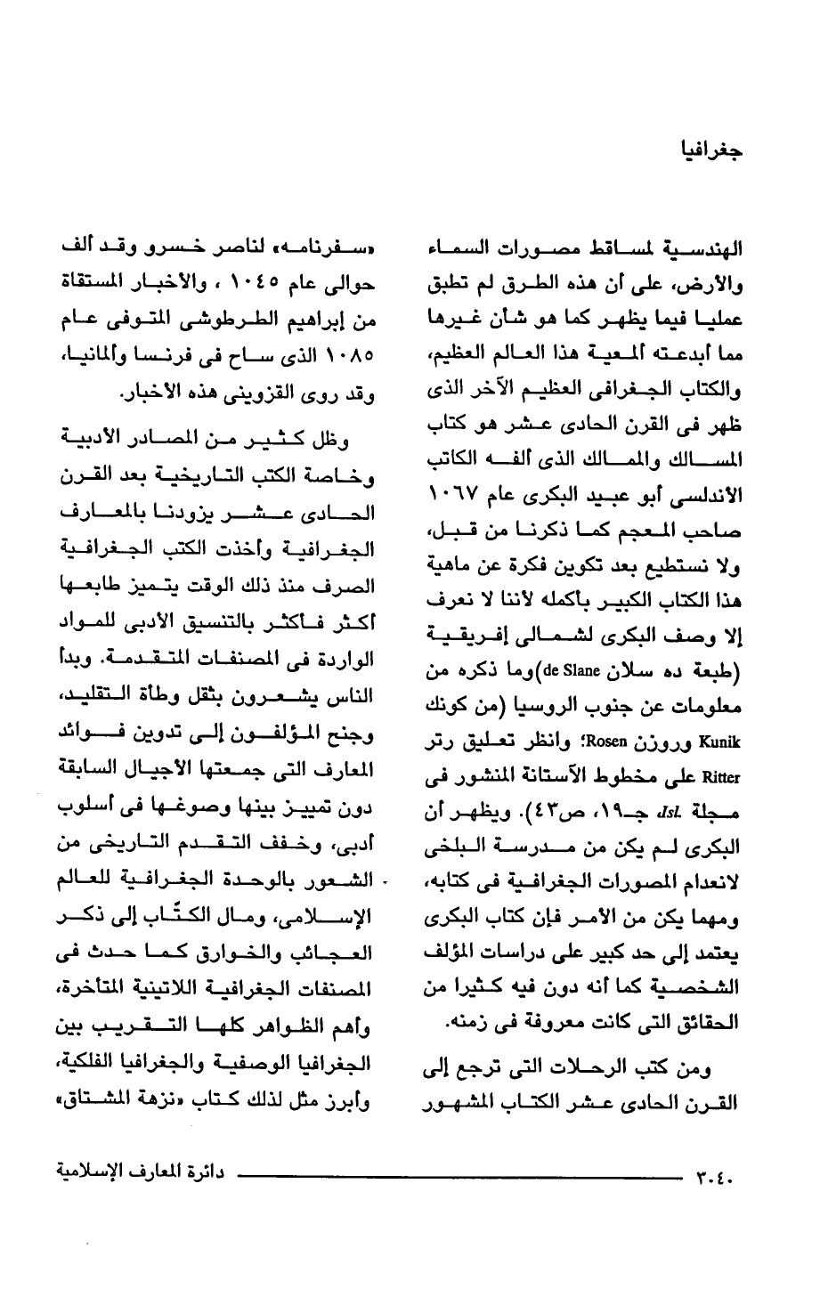 الهندسية لمساقط مصورات السماء والأرض، على أن هذه الطرق لم تطبق عمليا فيما يظهر كما هو شأن غيرها مما أبدعته ألمعية هذا العالم العظيم، والكتاب الجغرافي العظيم الآخر الذي ظهر في القرن الحادي عشر هو كتاب المسالك والممالك الذي ألفه الكاتب الأندلسى أبو عبيد البكرى عام 1067 صاحب المعجم كما ذكرنا من قبل، ولا نستطيع بعد تكوين فكرة عن ماهية هذا الكتاب الكبير بأكمله لأننا لا نعرف إلا وصف البكرى لشمالى إفريقية (طبعة ده سلان de Slane) وما ذكره من معلومات عن جنوب الروسيا (من كونك Kunik وروزن Rosen؛ وانظر تعليق رتر Ritter على مخطوط الآستانة المنشور في مجلة SLl. جـ 19، ص 43). ويظهر أن البكرى لم يكن من مدرسة البلخى لانعدام المصورات الجغرافية في كتابه، ومهما يكن من الأمر فإن كتاب البكرى يعتمد إلى حد كبير على دراسات المؤلف الشخصية كما أنه دون فيه كثيرا من الحقائق التي كانت معروفة في زمنه.