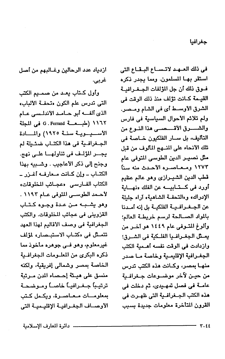 في ذلك العهد لاتساع البقاع التي استقر بها المسلمون. ومما يجدر ذكره فوق ذلك أن جل المؤلفات الجغرافية القيمة كانت تؤلف منذ ذلك الوقت في الشرق الأوسط في في الشام ومصر. ولم تلائم الأحوال السياسية في فارس والشرق الأقصى هذا النوع من التأليف، بل سار الفلكيون خاصة في تلك الأنحاء على المنهج المألوف من قبل مثل نصير الدين الطوسى المتوفى عام 1273 ومعاصره الأحدث منه سنًّا قطجـ 1 لدين الشيرازى وهو عالم عظيم أورد في كتابيه عن الفلك "نهاية الإدراك" و "التحفة الشاهية" آراء جليلة عن الجغرافية الفلكية بل إنه أمدنا بالمواد الصالحة لرسم خريطة العالم؛ وألوغ المتوفى عام 1449 هو آخر من يمثل الجغرافيا الفلكية في الشرق؛ وازدادت في الوقت نفسه أهمية الكتب الجغرافية الإقليمية وخاصة ها صدر منها بمصر، وكانت هذه الكتب تدرس من حين لآخر موضوعات جغرافية عامة في فصل تمهيدى، ثم دخلت في هذه الكتب الجغرافية التي ظهرت في القرون المتاخرة معلومات جديدة بسبب ازدياد عدد الرحالين وغالبهم من أصل غربي.