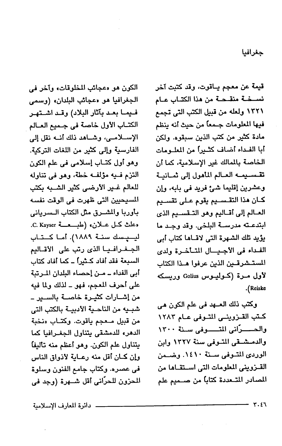 وكتب ذلك العهد في علم الكون هي كتب القزوينى المتوفى عام 1283 والحرّانى المتوفى سنة 1300 والدمشقى المتوفى سنة 1327 وابن الوردى المتوفى سنة 1410 وضمن القزوينى المعلومات التي استقاها من المصادر المتعددة كتابًا من صميم علم الكون هو "عجائب المخلوقات" وآخر في الجغرافيا هو "عجائب البلدان" (وسمى فيما بعد بآثار البلاد) وقد اشتهر الكتاب الأول خاصة في جميع العالم الإسلامي، وشاهد ذلك أنه نقل إلى الفارسية وإلى كثير من اللغات التركية. وهو أول كتاب إسلامي في علم الكون التزم فيه مؤلفه خطة، وهو في تناوله للعالم غير الأرضى كثير الشبه بكتب المسيحيين التي ظهرت في الوقت نفسه بأوربا والمشرق مثل الكتاب السريانى "علث كل علان" (طبعة C. Kayser. ليبسك سنة 1889). أما كتاب الجغرافيا الذي رتب على الأقاليم السبعة فقد أفاد كثيرًا -كما أفاد كتاب أبي الفداء- من إحصاء البلدان المرتبة على أحرف المعجم، فهو- لذلك ولما فيه من إشارات كثيرة خاصة بالسير- شبيه من الناحية الأدبية بالكتب التي من قبيل معجم ياقوت. وكتاب "نخبة الدهر" للدمشقى يتناول الجغرافيا كما يتناول علم الكون. وهو أعظم منه تأليفًا وإن كان أقل منه رعاية لأذواق الناس في عصره. وكتاب جامع الفنون وسلوة المحزون للحرّانى أقل شهرة (وجد في