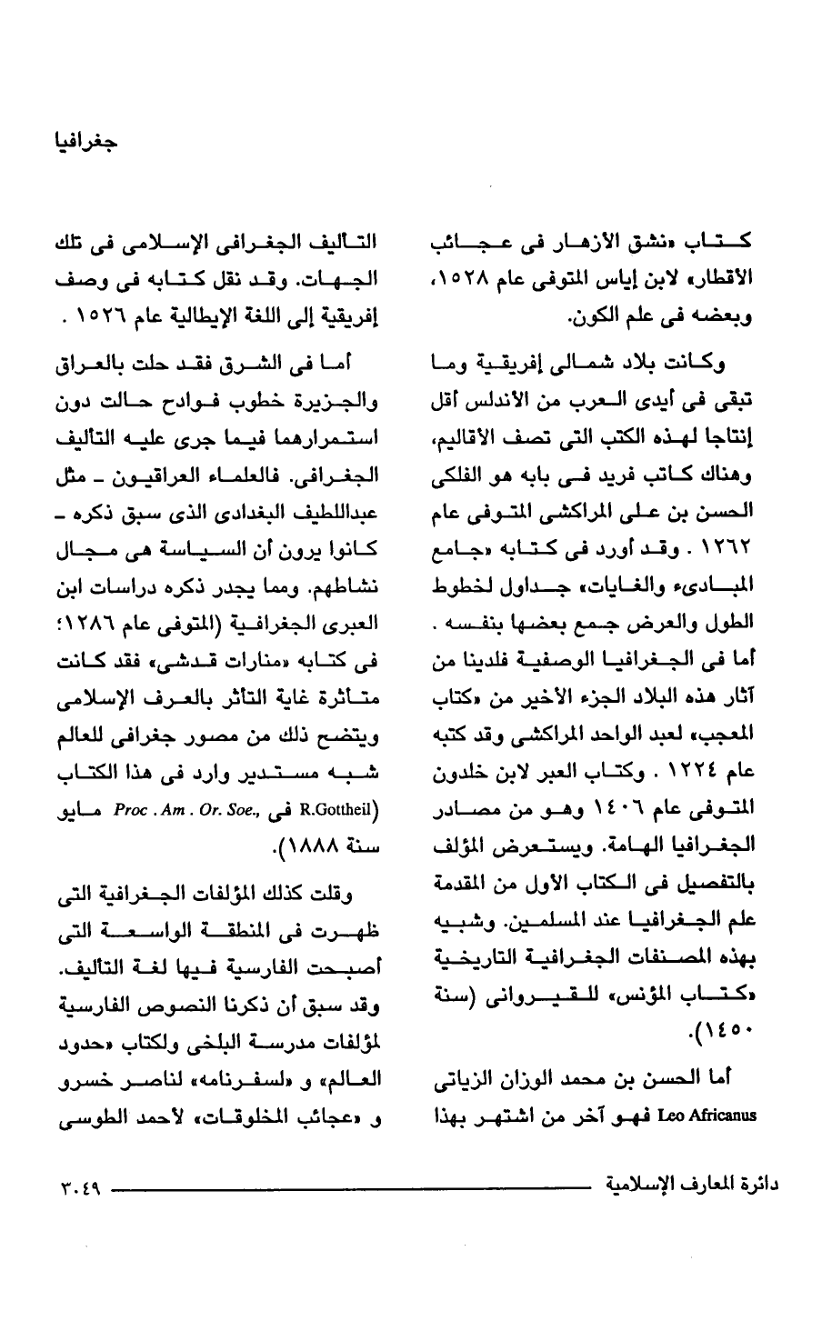 وقلت كذلك المؤلفات الجغرافية التي ظهرت في المنطقة الواسعة التي أصبحت الفارسية فيها لغة التأليف. وقد سبق أن ذكرنا النصوص الفارسية لمؤلفات مدرسة البلخى ولكتاب "حدود العالم " و "لسفرنامه" لناصر خسرو و "عجائب المخلوقات" لأحمد الطوسى