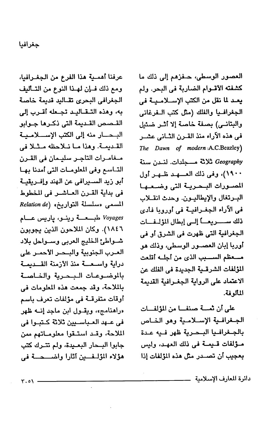 على أن ثمة صنفا من المؤلفات الجغرافية الإسلامية وهو الخاص بالجغرافيا البحرية ظهر فيه عدة مؤلفات قيمة في ذلك العهد، وليس بعجيب أن تصدر مثل هذه المؤلفات إذا عرفنا أهمية هذا الفرع من الجغرافيا، ومع ذلك فإن لهذا النوع من التأليف الجغرافي البحرى تقاليد قديمة خاصة به، وهذه التقاليد تجعله أقرب إلى القصص القديمة التي ذكرها جوابو البحار منه إلى الكتب الإسلامية القديمة. وهذا ما نلاحظه مثلًا في مغامرات التاجر سليمان في القرن التاسع وفي المعلومات التي أمدنا بها أبو زيد السيرافى عن الهند وإفريقية في بداية القرن العاشر في المخطوط المسمى "سلسلة التواريخ" (Relation de Voyages طبعة رينو، باريس عام 1846). وكان الملاحون الذين يجوبون شواطئ الخليج العربي وسواحل بلاد العرب الجنوبية والبحر الأحمر على دراية واسعة منذ الأزمنة القديمة بالموضوعات البحرية والخاصة بالملاحة، وقد جمعت هذه المعلومات في أوقات متفرقة في مؤلفات تعرف باسم "راهنامج"، ويقول ابن ماجد إنه ظهر في عهد العباسيين ثلاثة كتبوا في الملاحة، وقد استقوا معلوماتهم ممن جابوا البحار البعيدة، ولم تترك كتب هؤلاء المؤلفين آثارا واضحة في