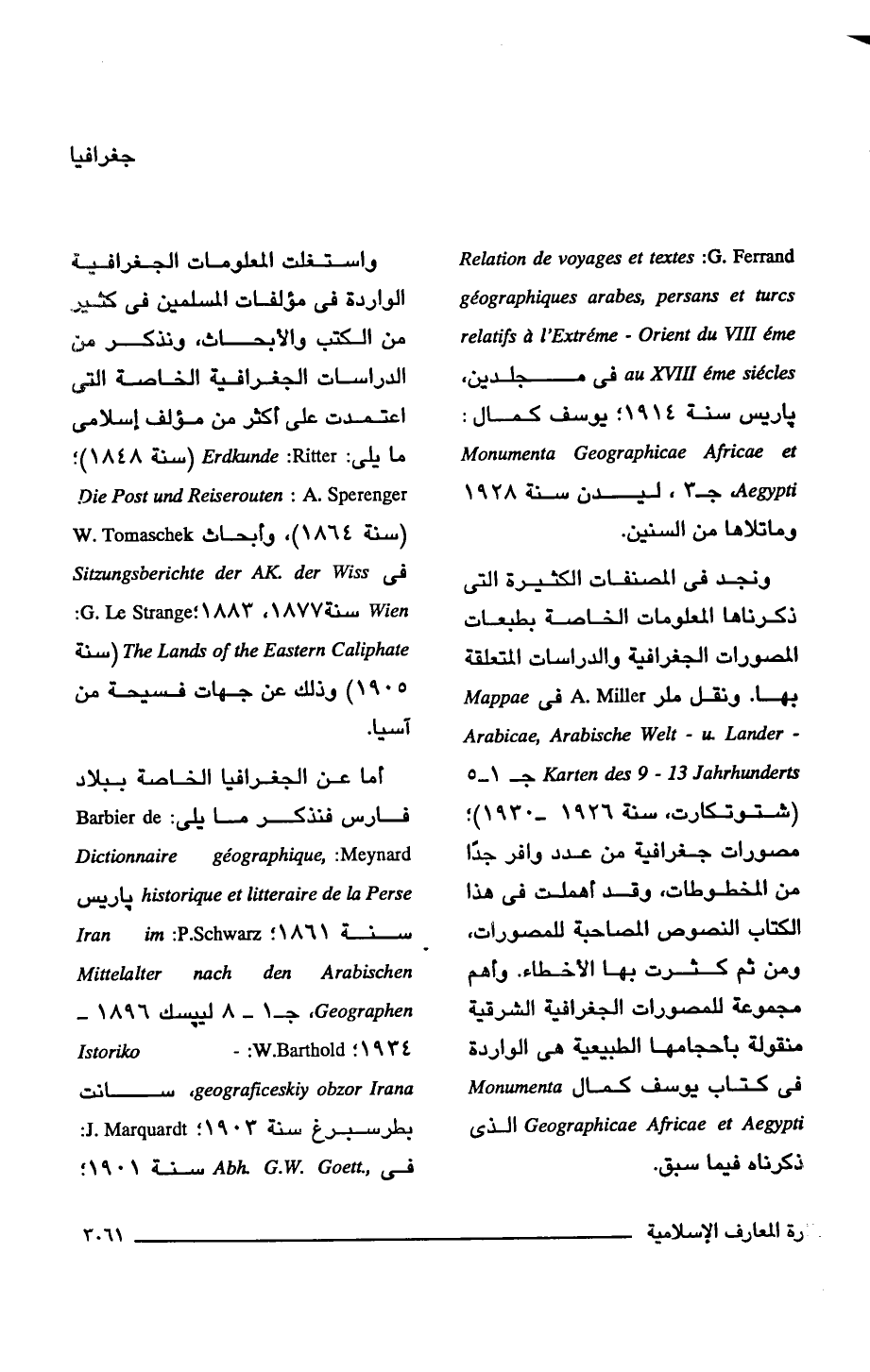 Relation de voyages et textes: G. Ferrand persans et tures , geographiques arabes a l'Extreme - Orient du VIII eme relatifs au XVIII eme siecles في مجلدين، باريس سنة 1914؛ يوسف كمال: Monumenta Geographicae Africae et Aegypti , جـ 3، ليدن سنة 1928 وما تلاها من السنين.