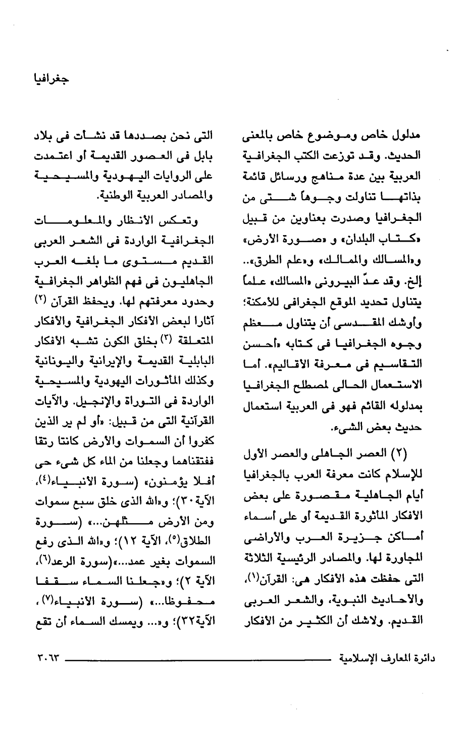 (2) العصر الجاهلى والعصر الأول للإسلام كانت معرفة العرب بالجغرافيا أيام الجاهلية مقصورة على بعض الأفكار المأثورة القديمة أو على أسماء أماكن جزيرة العرب والأراضى المجاورة لها. والمصادر الرئيسية الثلاثة التي حفظت هذه الأفكار هي: القرآن (9)، والأحاديث النبوية، والشعر العربي القديم. ولا شك أن الكثير من الأفكار التي نحن بصددها قد نشأت في بلاد بابل في العصور القديمة أو اعتمدت على الروايات اليهودية والمسيحية والمصادر العربية الوطنية.