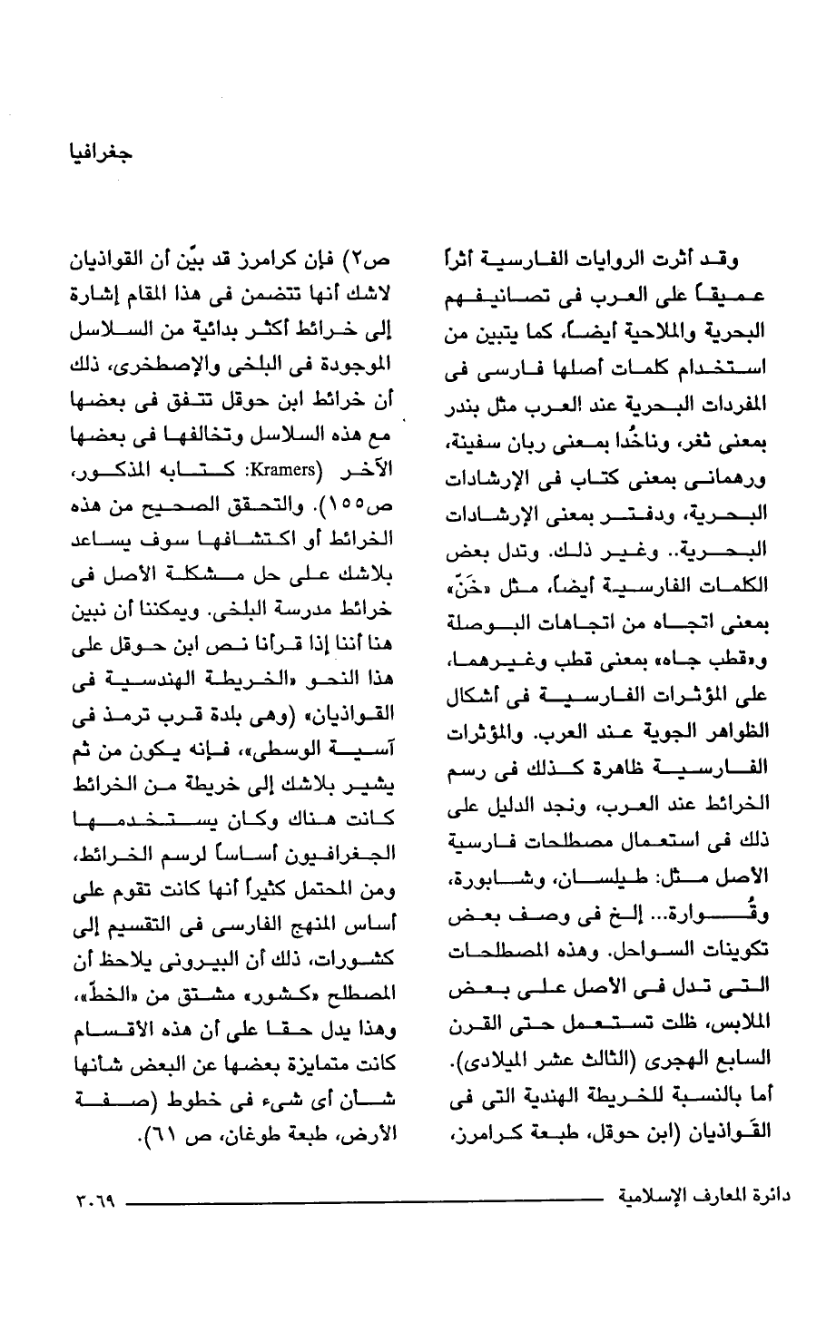 وقد أثرت الروايات الفارسية أثرًا عميقًا على العرب في تصانيفهم البحرية والملاحية أيضًا، كما يتبين من استخدام كلمات أصلها فارسى في المفردات البحرية عند العرب مثل بندر بمعنى ثغر، وناخُدا بمعنى ربان سفينة، ورهمانى بمعنى كتاب في الإرشادات البحرية، ودفتر بمعنى الإرشادات البحرية .. وغير ذلك. وتدل بعض الكلمات الفارسية أيضًا، مثل "خَنّ" بمعنى اتجاه من اتجاهات البوصلة و"قطب جاه" بمعنى قطب وغيرهما, على المؤثرات الفارسية في أشكال الظواهر الجوية عند العرب. والمؤثرات الفارسية ظاهرة كذلك في رسم الخرائط عند العرب، ونجد الدليل على ذلك في استعمال مصطلحات فارسية الأصل مثل: طيلسان، وشابورة، وقُوارة ... إلخ في وصف بعض تكوينات السواحل. وهذه المصطلحات التي تدل في الأصل على بعض الملابس، ظلت تستعمل حتى القرن السابع الهجرى (الثالث عشر الميلادي). أما بالنسبة للخريطة الهندية التي في القَواذيان (ابن حوقل، طبعة كرامرز، ص 2) فإن كرامرز قد بيّن أن القواذيان لاشك أنها تتضمن هْى هذا المقام إشارة إلى خرائط أكثر بدائية من السلاسل الموجودة في البلخى والإصطخرى، ذلك أن خرائط ابن حوقل تتفق في بعضها مع هذه السلاسل وتخالفها في بعضها الآخر (Kramers: كتابه المذكور, ص 155). والتحقق الصحيح من هذه الخرائط أو اكتشافها سوف يساعد بلاشك على حل مشكلة الأصل في خرائط مدرسة البلخى. ويمكننا أن نبين هنا أننا إذا قرأنا نص ابن حوقل على هذا النحو "الخريطة الهندسية في القواذيان" (وهي بلدة قرب ترمذ في آسية الوسطى"، فإنه يكون من ثم يشير بلاشك إلى خريطة من الخرائط كانت هناك وكان يستخدمها الجغرافيون أساسًا لرسم الخرائط، ومن المحتمل كثيرًا أنها كانت تقوم على أساس المنهج الفارسى في التقسيم إلى كشورات، ذلك أن البيرونى يلاحظ أن المصطلح "كشور" مشتق من "الخطّ"، وهذا يدل حقا على أن هذه الأقسام كانت متمايزة بعضها عن البعض شأنها شأن أي شيء في خطوط (صفة الأرض، طبعة طوغان، ص 61).