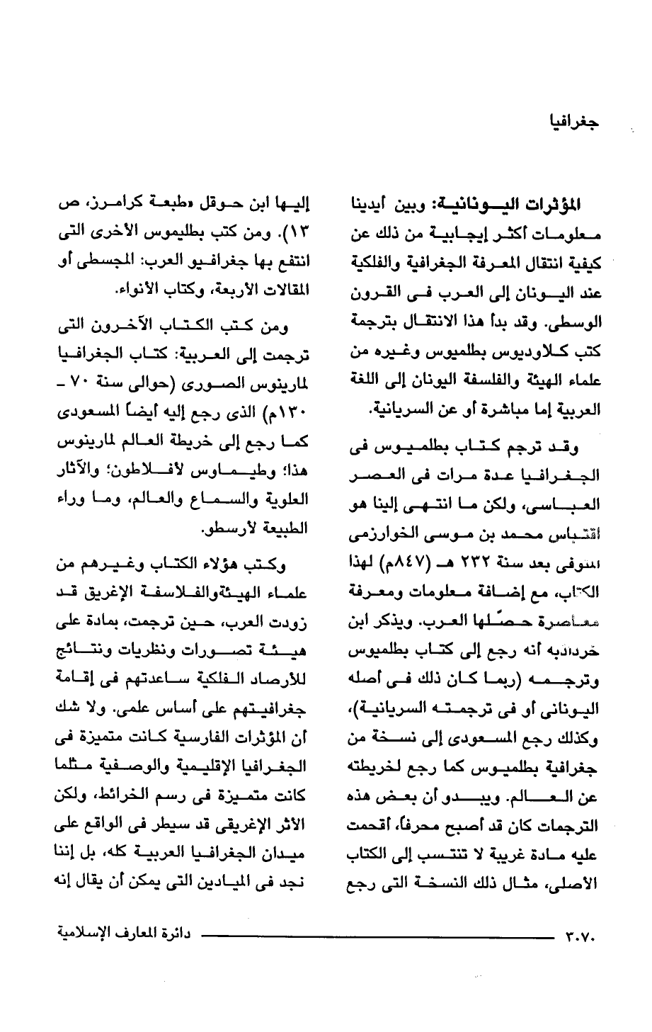 وكتب هؤلاء الكتاب وغيرهم من علماء الهيئة والفلاسفة الإغريق قد زودت العرب، حين ترجمت، بمادة على هيئة تصورات ونظريات ونتائج للأرصاد الفلكية ساعدتهم في إقامة جغرافيتهم على أساس علمي. ولا شك أن المؤثرات الفارسية كانت متميزة في الجغرافيا الإقليمية والوصفية مثلما كانت متميزة في رسم الخرائط، ولكن الأثر الإغريقى قد سيطر في الواقع على ميدان الجغرافيا العربية كله، بل إننا نجد في الميادين التي يمكن أن يقال أنه