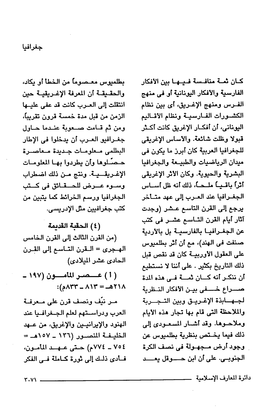 مر نيّف ونصف قرن على معرفة العرب ودراستهم لعلم الجغرافيا عند الهنود والإيرانيين والإغريق، من عهد الخليفة المنصور (136 - 157 هـ = 754 - 774 م) حتى عهد المأمون، فأدى ذلك إلى ثورة كاملة في الفكر