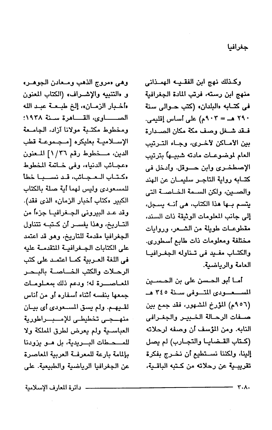 أما أبو الحسن علي بن الحسين المسعودى المتوفى سنة 345 هـ (956 م) المؤرخ المشهور، فقد جمع بين صفات الرحالة الخبير والجغرافى النابه. ومن المؤسف أن وصفه لرحلاته (كتاب القضايا والتجارب) لم يصل إلينا، ولكننا نستطيع أن نخرج بفكرة تقريبية عن رحلاته من كتبه الباقية، وهي "مروج الذهب ومعادن الجوهر" و "التنبيه والأشراف" (الكتاب امعنون "أخبار الزمان"، إلخ طبعة عبد الله الصاوى، القاهرة سنة 1938؛ ومخطوط مكتبة مولانا آزاد، الجامعة الإسلامية بعليكره [مجموعة قطب الدين، مخطوط رقم 36/ 1] المعنون "عجائب الدنيا"، وفي خاتمة المخطوط "كتاب العجائب، قد نسبا خطأ للمسعودى وليس لهما آية صلة بالكتاب الكبير "كتاب أخبار الزمان" الذي فقد). وقد عد البيرونى الجغرافيا جزءًا من التاريخ، وهذا يفسر أن كتبه تتناول الجغرافيا مقدمة للتاريخ، وهو قد اعتمد على الكتابات الجغرافية المتقدمة عليه في اللغة العربية كما اعتمد على كتب الرحلات والكتب الخاصة بالبحر المعاصرة له؛ ودعم ذلك بمعلومات جمعها بنفسه أثناء أسفاره أو من أناس لقيهم. ولم يسق المسعودى أي بيان منهجى تخطيطى للإمبراطورية العباسية ولم يعرض لطرق المملكة ولا للمحطات البريدية، بل هو يزودنا بإلمامة بارعة للمعرفة العربية المعاصرة عن الجغرافيا الرياضية والطبيعية. على