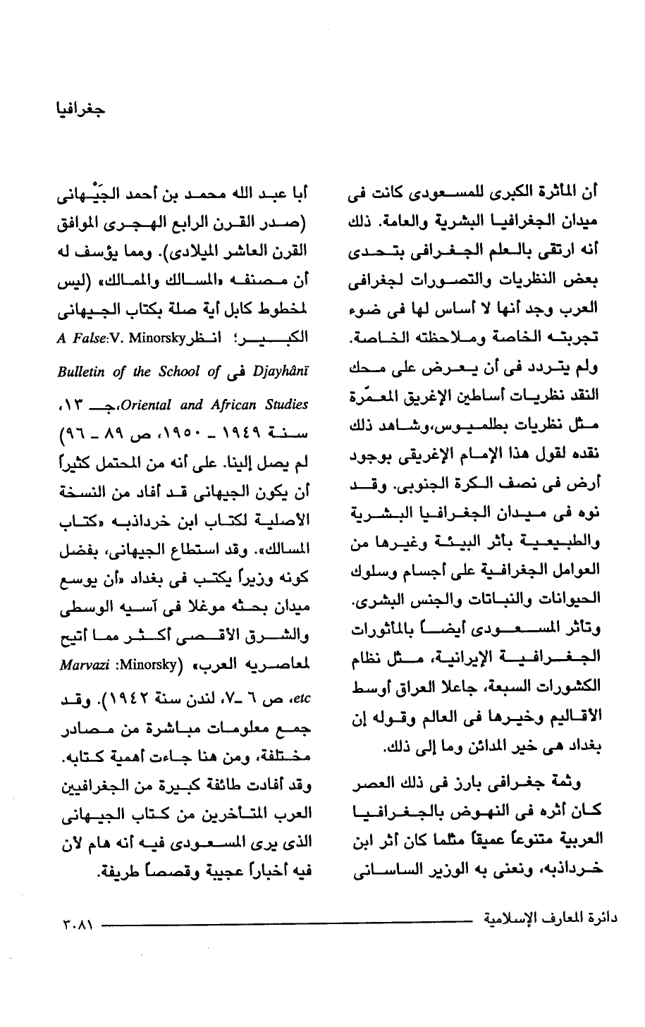 وثمة جغرافي بارز في ذلك العصر كان أثره في النهوض بالجغرافيا العربية متنوعًا عميقًا مثلما كان أثر ابن خرداذبه، ونعنى به الوزير الساسانى أبا عبد الله محمد بن أحمد الجَيهانى (صدر القرن الرابع الهجرى الموافق القرن العاشر الميلادي). ومما يؤسف له أن مصنفه "المسالك والممالك" (ليس لمخطوط كابل آية صلة بكتاب الجيهانى الكبير؛ انظر A FaLse: V. Minorsky Djayhani في Bulletin of the School of , Oriental and African Studies جـ 13، سنة 1949 - 1950, ص 89 - 96) لم يصل إلينا. على أنه من المحتمل كثيرًا أن يكون الجيهانى قد أفاد من النسخة الأصلية لكتاب ابن خرداذبه "كتاب المسالك". وقد استطاع الجيهانى، بفضل كونه وزيرًا يكتب في بغداد "أن يوسع ميدان بحثه موغلا في آسيه الوسطى والشرق الأقصى أكثر مما أتيح لمعاصريه العرب" (Marvazi: Minorsky etc، ص 6 - 7، لندن سنة 1942). وقد جمع معلومات مباشرة من مصادر مختلفة، ومن هنا جاءت أهمية كتابه. وقد أفادت طائفة كبيرة من الجغرافيين العرب المتأخرين من كتاب الجيهانى الذي يرى المسعودى فيه أنه هام لأن فيه أخبارًا عجيبة وقصصًا طريفة.