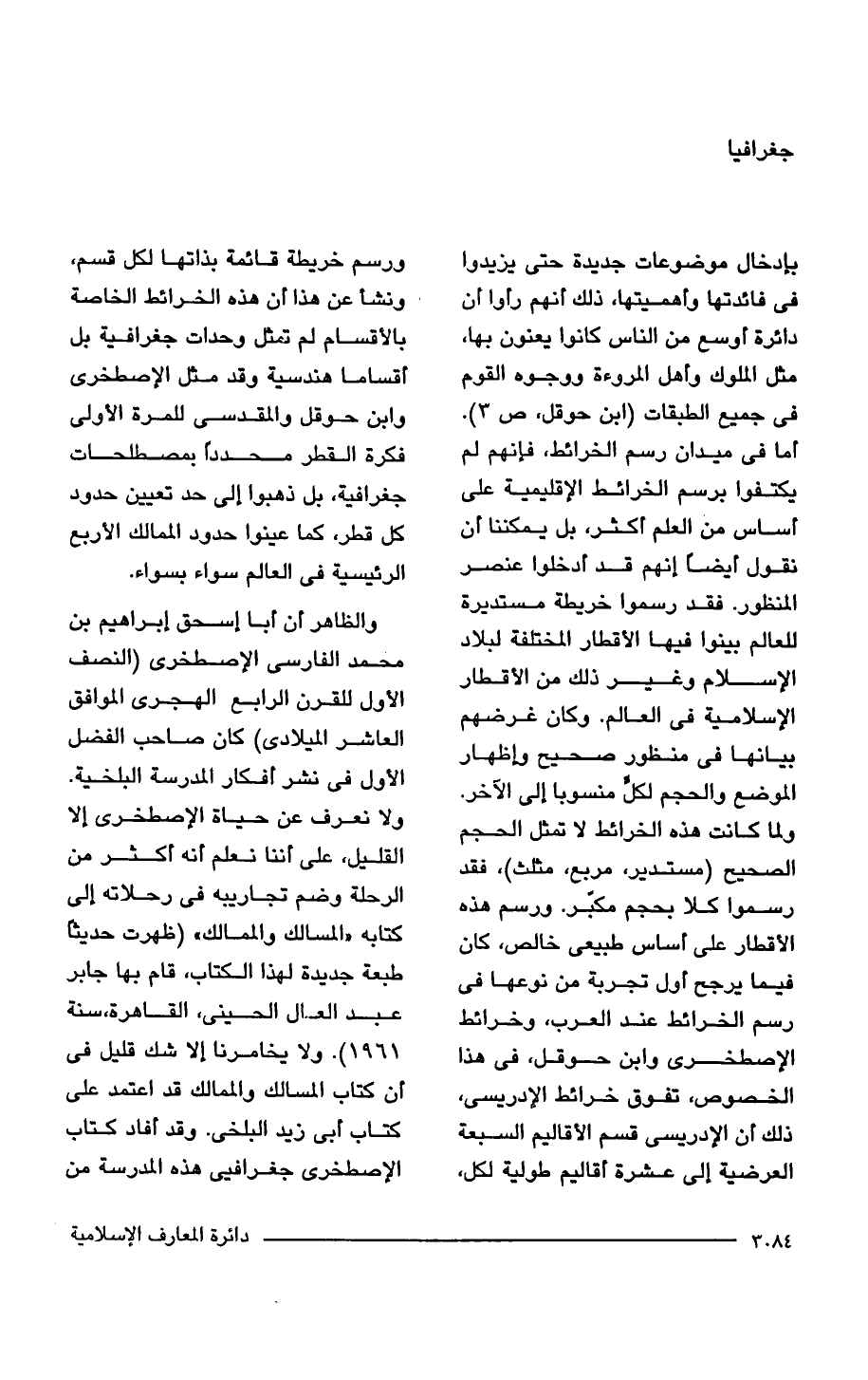 بإدخال موضوعات جديدة حتى يزيدوا في فائدتها وأهميتها، ذلك أنهم رأوا أن دائرة أوسع من الناس كانوا يعنون بها، مثل الملوك وأهل المروءة ووجوه القوم في جميع الطبقات (ابن حوقل، ص 3). أما في ميدان رسم الخرائط، فإنهم لم يكتفوا برسم الخرائط الإقليمية على أساس من العلم أكثر، بل يمكننا أن نقول أيضًا إنهم قد أدخلوا عنصر المنظور. فقد رسموا خريطة مستديرة للعالم بينوا فيها الأقطار المختلفة لبلاد الإسلام وغير ذلك من الأقطار الإسلامية في العالم. وكان غرضهم بيانها في منظور صحيح وإظهار الموضع والحجم لكلٍّ منسوبا إلى الآخر. ولما كانت هذه الخرائط لا تمثل الحجم الصحيح (مستدير، مربع، مثلث)، فقد رسموا كلا بحجم مكبّر. ورسم هذه الأقطار على أساس طبيعى خالص، كان فيما يرجح أول تجربة من نوعها في رسم الخرائط عند العرب، وخرائط الإصطخري وابن حوقل، في هذا الخصوص، تفوق خرائط الإدريسي، ذلك أن الإدريسي قسم الأقاليم السبعة العرضية إلى عشرة أقاليم طولية لكل، ورسم خريطة قائمة بذاتها لكل قسم، ونشأ عن هذا أن هذه الخرائط الخاصة بالأقسام لم تمثل وحدات جغرافية بل أقساما هندسية وقد مثل الإصطخري وابن حوقل والمقدسى للمرة الأولى فكرة القطر محددًا بمصطلحات جغرافية، بل ذهبوا إلى حد تعيين حدود كل قطر، كما عينوا حدود الممالك الأربع الرئيسية في العالم سواء بسواء.