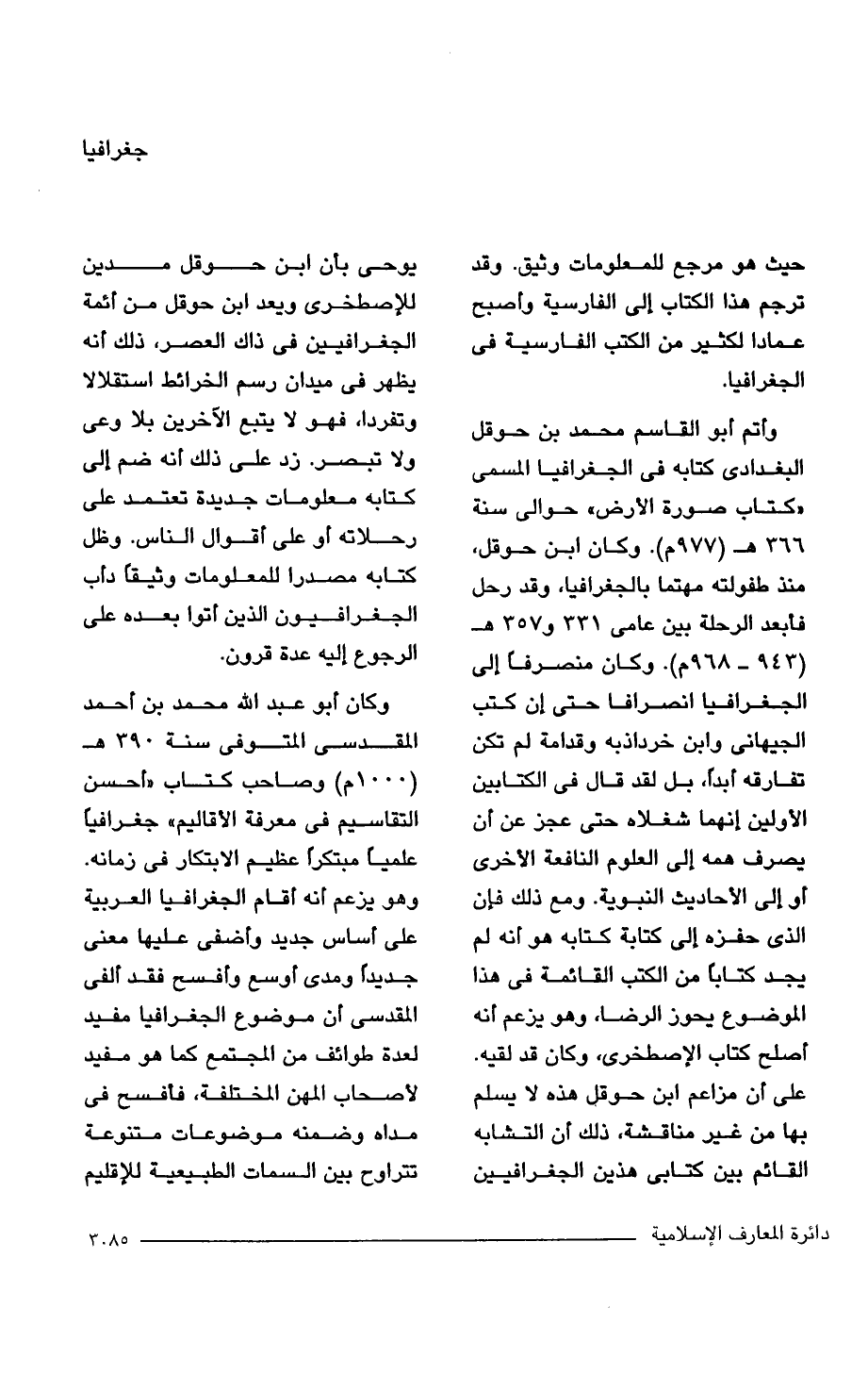 وأتم أبو القاسم محمد بن حوقل البغدادي كتابه في الجغرافيا المسمى "كتاب صورة الأرض" حوالي سنة 366 هـ (977 م). وكان ابن حوقل، منذ طفولته مهتما بالجغرافيا، وقد رحل فأبعد الرحلة بين عامي 331 و 357 هـ (943 - 968 م) وكان منصرفًا إلى الجغرافيا انصرافا حتى إن كتب الجيهانى وابن خرداذبه وقدامة لم تكن تفارقه أبدًا، بل لقد قال في الكتابين الأولين إنهما شغلاه حتى عجز عن أن يصرف همه إلى العلوم النافعة الأخرى أو إلى الأحاديث النبوية. ومع ذلك فإن الذي حفزه إلى كتابة كتابه هو أنه لم يجد كتابًا من الكتب القائمة في هذا الموضوع يحوز الرضا، وهو يزعم أنه أصلح كتاب الإصطخري، وكان قد لقيه. على أن مزاعم ابن حوقل هذه لا يسلم بها من غير مناقشة، ذلك أن التشابه القائم بين كتابى هذين الجغرافيين يوحى بأن ابن حوقل مدين للإصطخرى ويعد ابن حوقل من أئمة الجغرافيين في ذاك العصر، ذلك أنه يظهر في ميدان رسم الخرائط استقلالا وتفردا، فهو لا يتبع الآخرين بلا وعى ولا تبصر. زد على ذلك أنه ضم إلى كتابه معلومات جديدة تعتمد على رحلاته أو على أقوال الناس. وظل كتابه مصدرا للمعلومات وثيقًا دأب الجغرافيون الذين أتوا بعده على الرجوع إليه عدة قرون.