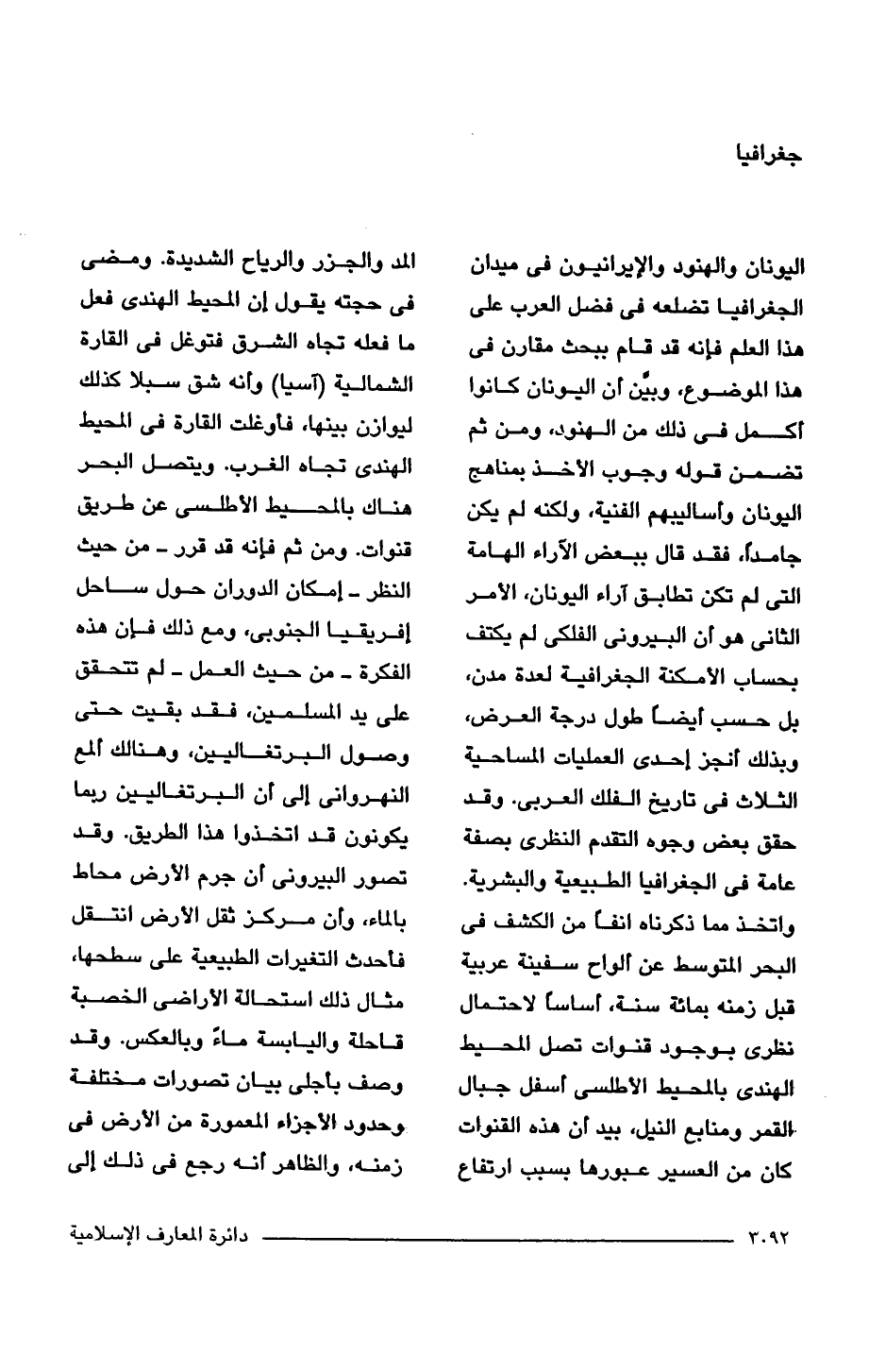 اليونان والهنود والإيرانيون في ميدان الجغرافيا تضلعه في فضل العرب على هذا العلم فإنه قد قام ببحث مقارن في هذا الموضوع، وبيَّن أن اليونان كانوا أكمل في ذلك من الهنود، ومن ثم تضمن قوله وجوب الأخذ بمناهج اليونان وأساليبهم الفنية، ولكنه لم يكن جامدًا، فقد قال ببعض الآراء الهامة التي لم تكن تطابق أراء اليونان، الأمر الثاني هو أن البيرونى الفلكى لم يكتف بحساب الأمكنة الجغرافية لعدة مدن، بل حسب أيضًا طول درجة العرض، وبذلك أنجز احدى العمليات المساحية الثلاث في تاريخ الفلك العربي. وقد حقق بعض وجوه التقدم النظرى بصفة عامة في الجغرافيا الطبيعية والبشرية. واتخذ مما ذكرناه انفًا من الكشف في البحر المتوسط عن ألواح سفينة عربية قبل زمنه بمائة سنة، أساسًا لاحتمال نظرى بوجود قنوات تصل المحيط الهندى بالمحيط الأطلسي أسفل جبال القمر ومنابع النيل، بيد أن هذه القنوات كان من العسير عبورها بسبب ارتفاع المد والجزر والرياح الشديدة. ومضى في حجته يقول أن المحيط الهندى فعل ما فعله تجاه الشرق فتوغل في القارة الشمالية (آسيا) وأنه شق سبلا كذلك ليوازن بينها، فاوغلت القارة في المحيط الهندى تجاه الغرب. ويتصل البحر هناك بالمحيط الأطلسي عن طريق قنواتء ومن ثم فإنه قد قرر- من حيث النظر- إمكان الدوران حول ساحل إفريقيا الجنوبي، ومع ذلك فإن هذه الفكرة- من حيث العمل- لم تتحقق على يد المسلمين، فقد بقيت حتى وصول البرتغاليين، وهنالك ألمع النهروانى إلى أن البرتغاليين ربما يكونون قد اتخذوا هذا الطريق. وقد تصور البيرونى أن جرم الأرض محاط بالماء، وأن مركز ثقل الأرض انتقل فأحدث التغيرات الطبيعية على سطحها، مثال ذلك استحالة الأراضي الخصبة قاحلة واليابسة ماءً وبالعكس. وقد وصف بأجلى بيان تصورات مختلفة حدود الأجزاء المعمورة من الأرض في زمنه، والظاهر أنه رجع في ذلك إلى