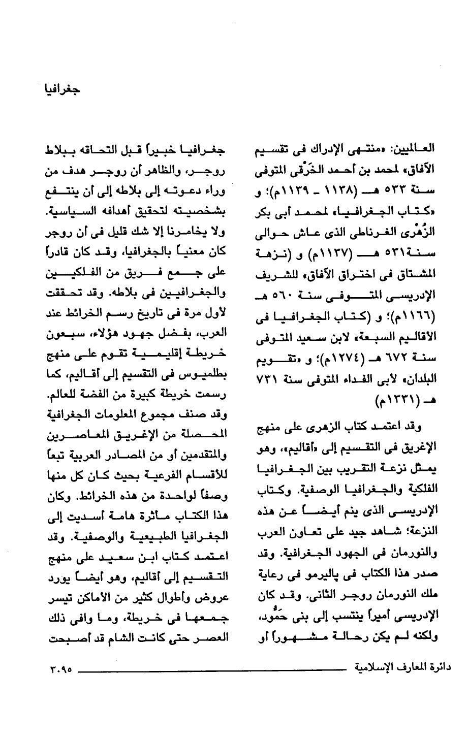 وقد اعتمد كتاب الزهري على منهج الاغريق في التقسيم إلى "أقاليم"، وهو يمثل نزعة التقريب بين الجغرافيا الفلكية والجغرافيا الوصفية. وكتاب الادريسى الذي ينم أيضًا عن هذه النزعة؛ شاهد جيد على تعاون العرب والنورمان في الجهود الجغرافية. وقد صدر هذا الكتاب في باليرمو في رعاية ملك النورمان روجر الثاني. وقد كان الادريسى أميرًا ينتسب إلى بنى حَمُّود، ولكنه لم يكن رحالة مشهورًا أو جغرافيا خبيرًا قبل التحاقه ببلاط روجر، والظاهر أن روجر هدف من وراء دعوته إلى بلاطه إلى أن ينتفع بشخصيته لتحقيق أهدافه السياسية. ولا يخامرنا إلا شك قليل في أن روجر كان معنيًا بالجغرافيا، وقد كان قادرًا على جمع فريق من الفلكيين والجغرافيين في بلاطه. وقد تحققت لأول مرة في تاريخ رسم الخرائط عند العرب، بفضل جهود هؤلاء، سبعون خريطة إقليمية تقوم على منهج بطلميوس في التقسيم إلى أقاليم، كما رسمت خريطة كبيرة من الفضة للعالم. وقد صنف مجموع المعلومات الجغرافية المحصلة من الاغريق المعاصرين والمتقدمين أو من المصادر العربية تبعًا للأقسام الفرعية بحيث كان كل منها وصفا لواحدة من هذه الخرائط. وكان هذا الكتاب مأثرة هامة أسديت إلى الجغرافيا الطبيعية والوصفية. وقد اعتمد كتاب ابن سعيد على منهج التقسيم إلى أقاليم، وهو أيضًا يورد عروض وأطوال كثير من الأماكن تيسر جمعها في خريطة، وما وافى ذلك العصر حتى كانت الشام قد أصبحت