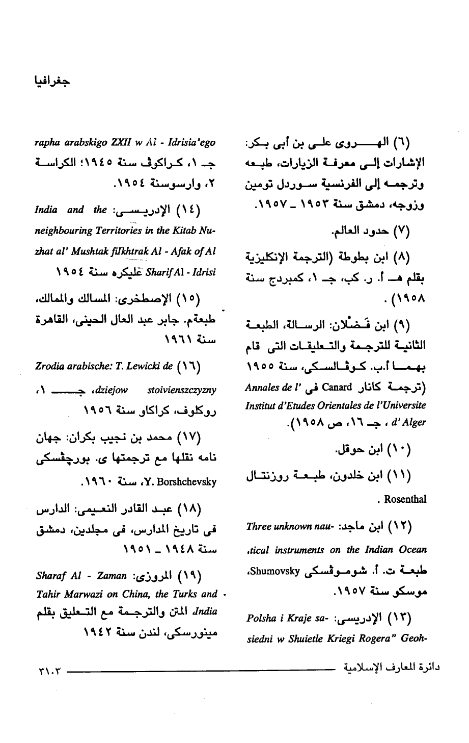 (13) الإدريسي: Polsha i Ktaje sa - siedni w Shuietle Kriegi Rogera" Geoh rapha arabskigo ZXII w Al - Idrisia'ega جـ 1، كراكوف سنة 1945؛ الكراسة 2، وارسو سنة 1954.