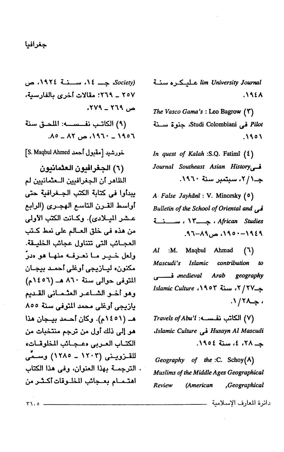 (6) Al: M. Maqbul Ahmad Mascudi's Islamic contribution to medieval Arab geography، في جـ 2/ 27، سنة 1953، Islamic Culture، جـ 1/ 28.