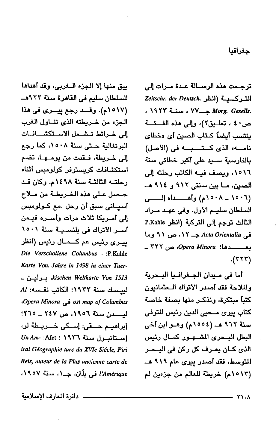 أما في ميدان الجغرافيا البحرية والملاحة فقد أصدر الأتراك العثمانيون كتبًا مبتكرة، ونذكر منها بصفة خاصة كتاب ييرى محيي الدين رئيس المتوفى سنة 962 هـ (1554 م) وهو ابن أخي البطل البحرى المشهور كمال رئيس الذي كان يعرف كل ركن في البحر المتوسط، فقد أصدر ييرى عام 919 هـ (1513 م) خريطة للعالم من جزءين لم يبق منها إلا الجزء الغربي، وقد أهداها للسلطان سليم في القاهرة سنة 923 هـ (1517 م). وقد رجع ييري في هذا الجزء من خريطته الذي تناول الغرب إلى خرائط تشمل الاستكشافات البرتغالية حتى سنة 1508، كما رجع إلى خريطة، فقدت من يومها، تضم استكشافات كريستوفر كولومبس أثناء رحلته الثالثة سنة 1498 م. وكان قد حصل على هذه الخريطة من ملاح أسيانى سبق أن رحل. مع كولومبس إلى أمريكا ثلاث مرات وأسره فيمن أسر الأتراك في بلنسية سنة 1501 ييرى رئيس عم كمال رئيس (انظر P.Kahle: - Die Verschollene Columbus -Karte Von. Jahre in 1498 in einer Tuer kischen Weltkarte Von 1513، برلين- ليبسك سنة 1933, الكاتب نفسه: Al ost map of Columbus في Opera Minora, ليدن سنة 1956، ص 247 - 265؛ إبراهيم حقى: إسكى خريطة لر، إستانبول سنة 1936؛ Un Am-: Afet iral Geographie turc du XVle Siecle.Piri Reis, auteur de la Plus ancienne carte de l'Amerique، في بلّتن، جـ 1، سنة 1957،