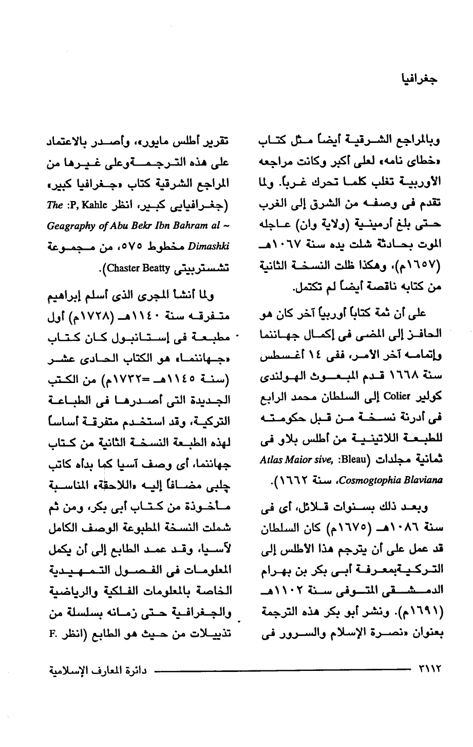 وبعد ذلك بسنوات قلائل، أي في سنة 1086 هـ (1675 م) كان السلطان قد عمل على أن يترجم هذا الأطلس إلى التركية بمعرفة أبي بكر بن بهرام الدمشقي المتوفى سنة 1102 هـ. 1691 م). ونشر أبو بكر هذه الترجمة بعنوان "نصرة الإسلام والسرور في تقرير أطلس مايور" صدر بالاعتماد على هذه الترجمة وعلى غيرها من المراجع الشرقية كتاب "جغرافيا كبير" (جغرافيايى كبير، انظر The: P, Kahle - Geagraphy of Abu Bekr Ibn Bahram al Dimashki مخطوط 575، من مجموعة تشستربيتى Chaster Beatty).