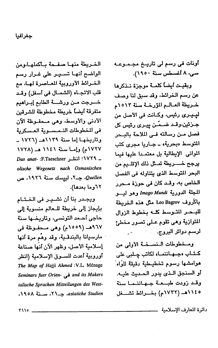 وبقيت أيضًا كلمة موجزة نذكرها عن رسم الخرائط، وقد سبق لنا وصف خريطة العالم المؤرخة سنة 1513 م لييرى رئيس، وكانت في الأصل من جزئين، وقد ضمّن ييرى رئيس كل فصل من رسالته في الملاحة بالبحر المتوسط "بحرية"- جاريا مجرى كتب الموانى الايطالية بل معتمدا عليها فيما يرجح خريطة تمثل ذلك الأقليم من البحر المتوسط الذي يتناوله في الفصل الخاص به، وقد كان في حوزة محرر المجلة الدورية Imago Mundi وهو ليو باكَروف Leo Bagrov مثل هذه الخريطة للبحر المتوسط كله بخطوط الزوال المتوازية وهي تقوم على تصور مخطئ لرسم دوائر البروج.