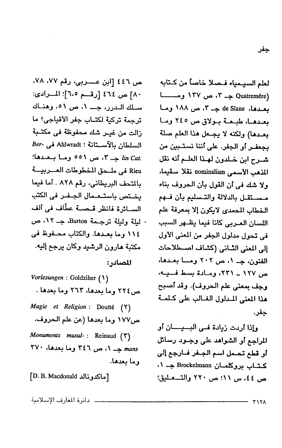 وإذا أردت زيادة في البيان أو المراجع أو الشواهد على وجود رسائل أو قطع تحمل اسم الجفر فارجع إلى كتاب بروكلمان Brockelmann جـ 1، ص 44 س 11؛ ص 220 والتعليق؛ ص 446 [ابن عربي، رقم 77، 78، 80] ص 464 [رقم 5، 6]؛ المرادى: سلك الدرر، جـ 1، ص 51، وهناك ترجمة تركية لكتاب جفر الأقياجى؟ ما زالت من غير شك محفوظة في مكتبة السلطان بالآستانة؛ Ahlwradt في Ber- . lin Cat جـ 3، ص 551 وما بعدها؛ Rieu في ملحق المخطوطات العربية بالمتحف البريطانى، رقم 828 أما فيما يختص باستعمال الجفر في الكتب السائرة فانظر قصة عطّاف في ألف ليلة وليلة ترجمة Burton، جـ 12، ص 114 وما بعدها. والكتاب محفوظ في مكتبة هارون الرشيد وكان يرجع إليه.