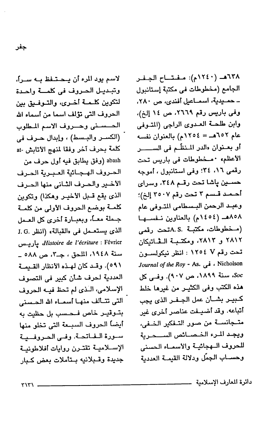 638 هـ (1240 م): مفتاح الجفر الجامع (مخطوطات في مكتبة إستانبول - حميدية، إسماعيل أفندى، ص 280، وفي باريس رقم 2669، ص 14 إلخ)، وابن طلحة العدوي الراجي (المتوفى عام 652 هـ-1254 م) بالعنوان نفسه أو بعنوان "الدر المنظّم في السر الأعظم". مخطوطات في باريس تحت رقمى 16، 34؛ وفي استانبول، أموجه حسين باشا تحت رقم 348، وسراى أحمد قسم 3 تحت رقم 3507 إلخ)؛ وعبد الرحمن البسطاهى المتوفى عام 858 هـ (1454 م) بالعناوين نفسها (مخطوطات، مكتبة A. S. تحت رقمي 2812 و 2813 ومكتبة الفاتيكان تحت رقم V 1254: انظر نيكولسون Nicholson . في. Journal of the Roy - As Soc، سنة 1899 ص 907). وفي كل هذه الكتب وفي الكثير من غيرها خلط كبير بشأن عمل الجفر الذي يجب أتباعه. وقد أضيفت عناصر أخرى غير متجانسة من صور إلتفكير الخفى، ويجد المرء الخصائص السحرية للحروف الهجائية والأسماء الحسنى وحساب الجمّل ودلالة القيمة العددية لاسم يود المرء أن يحتفظ به سرًّا، وتبديل الحروف في كلمة واحدة لتكوين كلمة أخرى، والتوفيق بين الحروف التي تؤلف اسمًا من أسماء الله الحسنى وحروف الاسم المطلوب (الكسر والبسط)، دابدال حرف في كلمة بحرف آخر وفقا لمنهج الأتابش- at abash (وفق يطابق فيه أول حرف من الحروف الهجائية العبرية الحرف الأخير والحرف الثاني منها الحرف الذي يقع قبل الأخير وهكذا) وتكوين كلمة بوضع الحروف الأولى من كلمة جملة معًا، وبعبارة أخرى كل العمل الذي يستعمل في "القبالة" (انظر. J. G. Histoire de l'ecriture: Fevriet باريس سنة 1948، الملحق، جـ 3، ص 588 - 591). وقد كان لهذه الأنظار القيمة العددية لحرف شأن كبير في التصوف الإسلامي، الذي لم تحظ فيه الحروف التي تتألف منها أسماء الله الحسنى بتوقير خاص فحسب بل حظيت به أيضًا الحروف السبعة التي تخلو منها سورة الفاتحة. وفي الحروفية الإسلامية تقترن روايات أفلاطونية جديدة وقبلانيه بتأملات بعض كبار