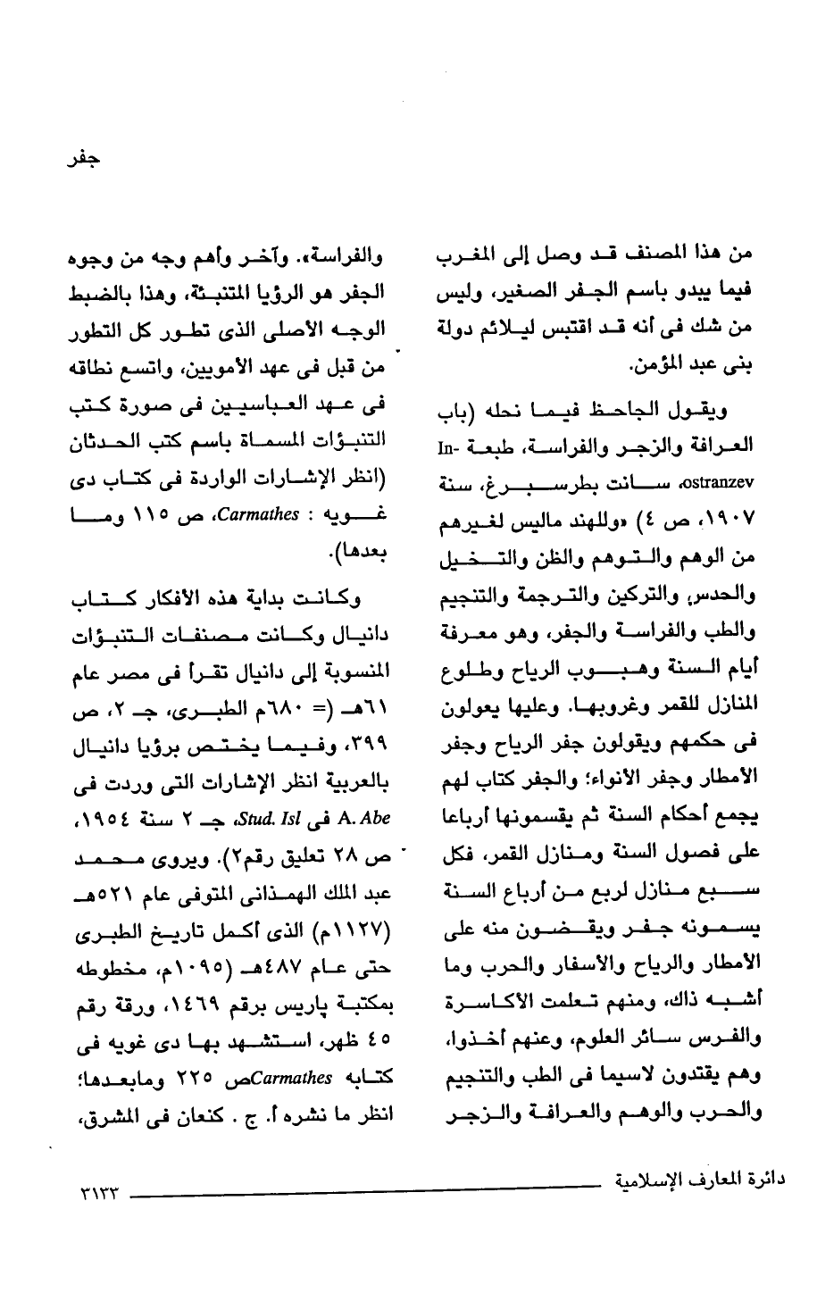 ويقول الجاحظ فيما نحله (باب العرافة والزجر والفراسة، طبعة- In ostranzev. سانت بطرسبرغ، سنة 1907، ص 4) "وللهند ما ليس لغيرهم من الوهم والتوهم والظن والتخيل والحدس والتركين والترجمة والتنجيم والطب والفراسة والجفر، وهو معرفة أيام السنة وهبوب الرياح وطلوع المنازل للقمر وغروبها. وعليها يعولون في حكمهم ويقولون جفر الرياح وجفر الأمطار وجفر الأنواء؛ والجفر كتاب لهم يجمع أحكام السنة ثم يقسمونها أرباعا على فصول السنة ومنازل القمر، فكل سبع منازل لربع من أرباع السنة يسمونه جفر ويقضون منه على الأمطار والرياح والأسفار والحرب وما أشبه ذاك، ومنهم تعلمت الأكاسرة والفرس سائر العلوم، وعنهم أخذوا، وهم يقتدون لاسيما في الطب والتنجيم والحرب والوهم والعرافة والزجر والفراسة". وآخر وأهم وجه من وجوه الجفر هو الرؤيا المتنبئة، وهذا بالضبط الوجه الأصلي الذي تطور كل التطور من قبل في عهد الأمويين، واتسع نطاقه في عهد العباسيين في صورة كتب التنبؤات المسماة باسم كتب الحدثان (انظر الإشارات الواردة في كتاب دى غويه: Carmathes . ص 115 وما بعدها).