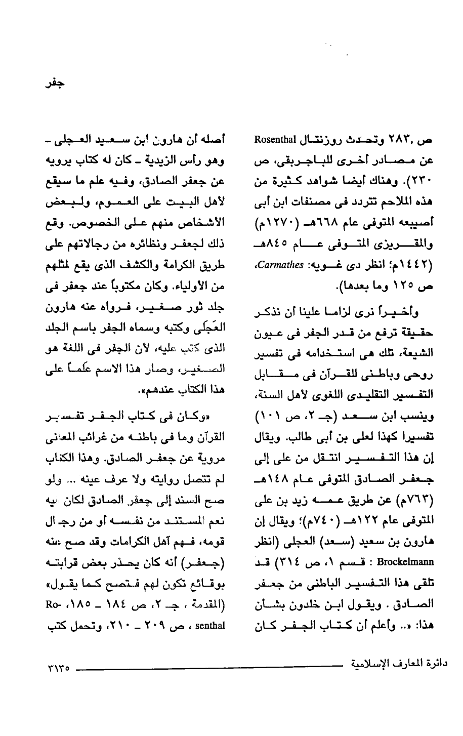 وكان في كتاب الجفر تفسير القرآن وما في باطنه من غرائب المعاني مروية عن جعفر الصادق. وهذا الكتاب لم تتصل روايته ولا عرف عينه ... ولو صح السند إلى جعفر الصادق لكان فيه نعم المستند من نفسه أو من رجال قومها، فهم أهل الكرامات وقد صح عنه (جعفر) أنه كان يحذر بعض قرابته بوقائع تكون لهم فتصبح كما قال " (المقدمة، جـ 2، ص 184 - 185، Ro- senthal , ص 209 - 210، وتحمل كتب
