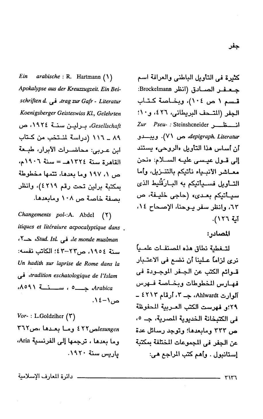 كثيرة في التأويل الباطنى والعرافة اسم جعفر الصادق (انظر Brnckelmann: قسم 1 ص 104)، وبخاصة كتاب الجفر (المتحف البريطانى، 426، و 10؛ انظر Zur Pseu-: Steinshcneider depigraph. Literatur ص 71). ويبدو أن أساس هذا التأويل "الروحى، يستند إلى قول عيسى - عليه السلام -: "نحن معاشر الأنبياء نأتيكم بالتنزيل، وأما التأويل فسياتيكم به البارَقْليط الذي سيأتيكم بعدى" (حاجى خليفة، ص 63، وانظر سفر يوحنا، الإصحاح 14، آية 126).