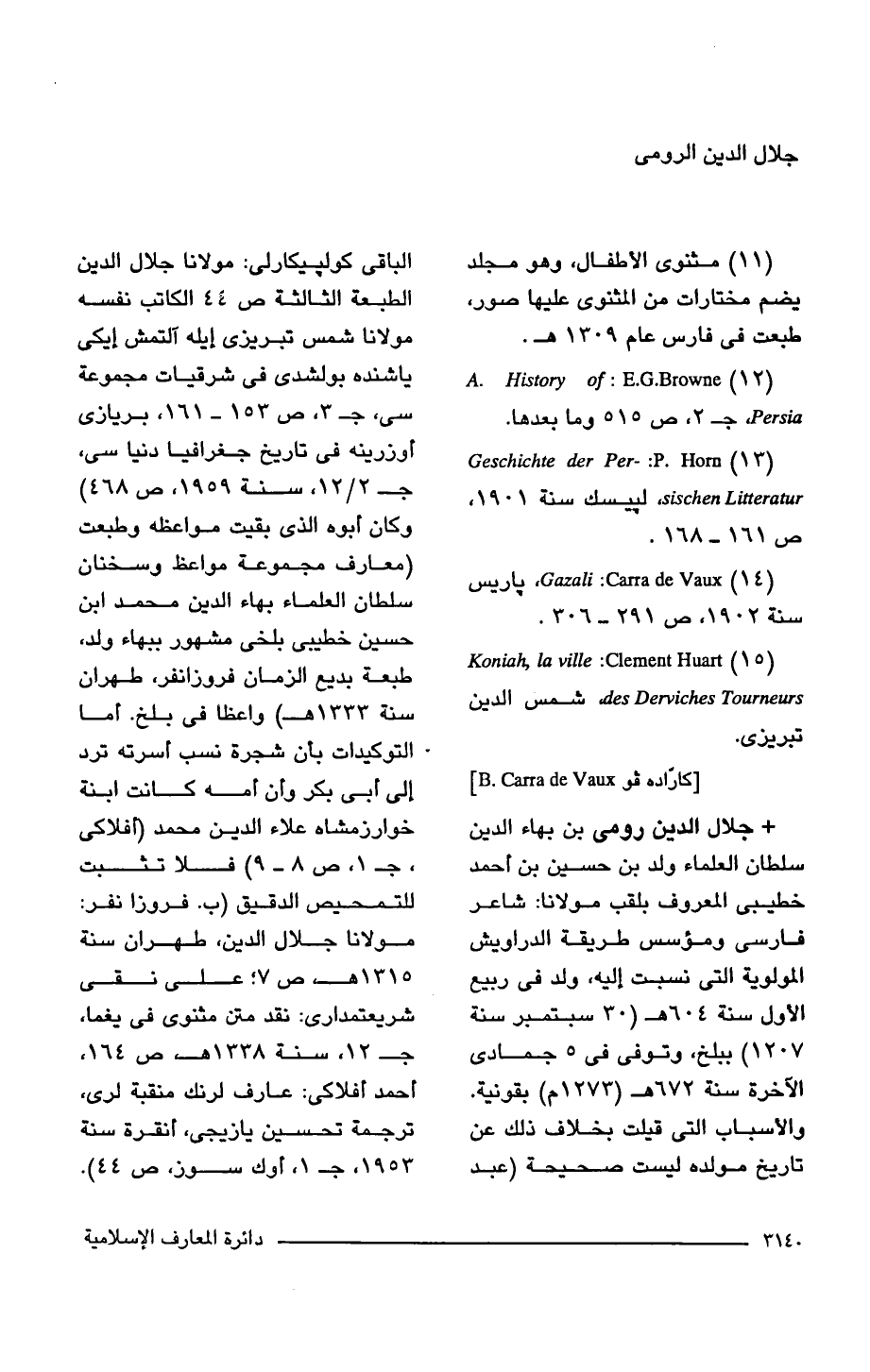 + جلال الدين رومى بن بهاء الدين سلطان العلماء ولد بن حسين بن أحمد خطيبى المعروف بلقب مولانا: شاعر فارسى ومؤسس طريقة الدراويش المولوية التي نسبت إليه، ولد في ربيع الأول سنة 604 هـ (30 سبتمبر سنة 1207) ببلخ، وتوفى في 5 جمادى الآخرة سنة 672 هـ (1273 م) بقونية. والأسباب التي قيلت بخلاف ذلك عن تاريخ مولده ليست صحيحة (عبد الباقي كولبيكارلى: مولانا جلال الدين الطبعة الثالثة ص 44 الكاتب نفسه مولانا شمس تبريزى إيله التمش إيكى ياشنده بولشدى في شرقيات مجموعة سى، جـ 3، ص 153 - 161 بريازى أوزرينه في تاريخ جغرافيا دنيا سى، جـ 2/ 12 , سنة 1959، ص 468) وكان أبوه الذي بقيت مواعظه وطبعت (معارف مجموعة مواعظ وسخنان سلطان العلماء بهاء الدين محمد ابن حسين خطيبى بلخى مشهور ببهاء ولد، طبعة بديع الزمان فروزانفر، طهران سنة 1333 هـ) واعظا في بلخ. أما التوكيدات بأن شجرة نسب أسرته ترد إلى أبي بكر وأن أمه كانت ابنة خوارزمشاه علاء الدين محمد أفلاكى، جـ 1، ص 8 - 9) فلا تثبت للتمحيص الدقيق (ب. فروزا نفر: مولانا جلال الدين، طهران سنة 1315 هـ، ص 7؛ على نقى شريعتمدارى: نقد متن مثنوى في يغما، جـ 12، سنة هـ، ص 164، أحمد أفلاكى: عارف لرنك منقبة لرى، ترجمة تحسين يازيجى، أنقرة سنة 1953، جـ 1، أوك سوز، ص 44).