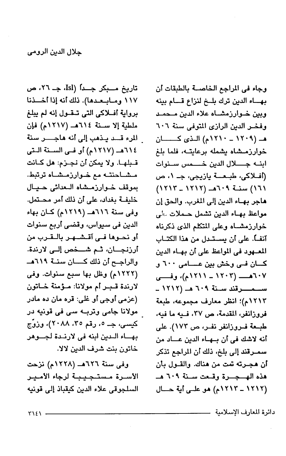 وجاء في المراجع الخاصة بالطبقات أن بهاء الدين ترك بلخ لنزاع قام بينه وبين خوارزمشاه علاء الدين محمد وفخر الدين الرازي المتوفى سنة 606 هـ (1209 - 1210 م) الذي كان خوارزمشاه يشمله برعايته، فلما بلغ ابنه جلال الدين خمس سنوات (أفلاكى، طبعة يازيجى، جـ 1، ص 161) سنة 609 هـ (1212 - 1213) هاجر بهاء الدين إلى المغرب. والحق أن مواعظ بهاء الدين تشمل حملات على خوارزمشاه وعلى المتكلم الذي ذكرناه أنفًا. على أن يستدل من هذا الكتاب المعهود في المواعظ على أن بهاء الدين كان في وخش بين عامي 600 و 607 هـ (1203 - 1211 م) وفي سمرقند سنة 609 هـ (1212 - 1213 م)؛ انظر معارف مجموعه، طبعة فروزانفر، المقدمة، ص 37، فيه ما فيه، طبعة فروزانفر نفر، ص 173). علي أنه لا شك في أن بهاء الدين عاد من سمرقند إلى بلخ، ذلك أن المراجع تذكر أن هجرته تمت من هناك. والقول بأن هذه الهجرة وقعت سنة 609 هـ (1212 - 1213 م) هو على آية حال تاريخ مبكر جدًّا (Isl، جـ 26، ص 117 وما بعدها). ذلك أنه إذا أخذنا برواية أفلاكى التي تقول إنه لم يبلغ ملطية إلا سنة 614 هـ (1217 م) فإن المرء قد يذهب إلى أنه هاجر سنة 614 هـ (1217 م) أو في السنة التي قبلها. ولا يمكن أن نجزم: هل كانت مشاحنته مع خوارزمشاه ترتبط. بموقف خوارزمشاه العدائى حيال خليفة بغداد، على أن ذلك أمر محتمل. وفي سنة 616 هـ (1219 م) كان بهاء الدين في سيواس، وقضى أربع سنوات أو نحوها في آقشهر بالقرب من أرزنجان، ثم شخص إلى لارندة. والراجح أن ذلك كان سنة 619 هـ (1222 م) وظل بها سبع سنوات. وفي لارندة قبر أم مولانا: مؤمنة خاتون (عزمى أوجى أو غلى: قره مان ده مادر مولانا جامى وتربه سى في قونيه در كيسى، جـ 5، رقم 5، وزوّج بهاء الدين ابنه في لارندة لجوهر خاتون بنت شرف الدين لالا.
