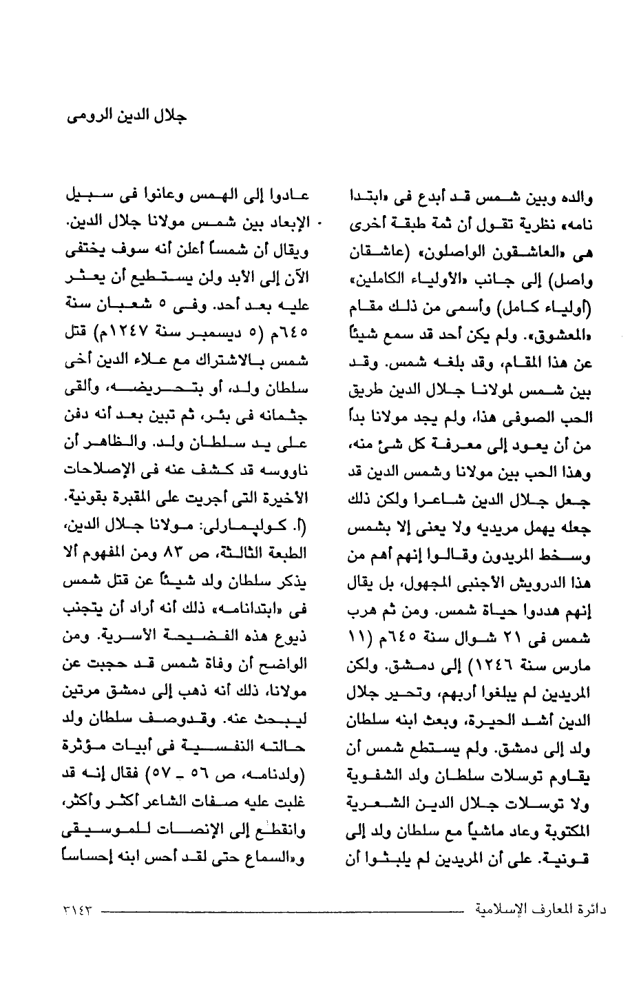والده وبين شمس قد أبدع في "ابتدا نامه " نظرية تقول أن ثمة طبقة أخرى هي "العاشقون الواصلون" (عاشقان واصل) إلى جانب "الأولياء الكاملين" (أولياء كامل) وأسمى من ذلك مقام "المعشوق". ولم يكن أحد قد سمع شيئًا عن هذا المقام، وقد بلغه شمس. وقد بين شمس لمولانا جلال الدين طريق الحب الصوفى هذا، ولم يجد مولانا بدًا من أن يعود إلى معرفة كل شيء منه، وهذا الحب بين مولانا وشمس الدين قد جعل جلال الدين شاعرا ولكن ذلك جعله يهمل مريديه ولا يعني إلا بشمس وسخط المريدون وقالوا إنهم أهم من هذا الدرويش الأجنبي المجهول، بل يقال إنهم هددوا حياة شمس. ومن ثم هرب شمس في 21 شوال سنة 645 م (11 مارس سنة 1246) إلى دمشق. ولكن المريدين لم يبلغوا أربهم، وتحير جلال الدين أشد الحيرة، وبعث ابنه سلطان ولد إلى دمشق. ولم يستطع شمس أن يقاوم توسلات سلطان ولد الشفوية ولا توسلات جلال الدين الشعرية المكتوبة وعاد ماشيًا مع سلطان ولد إلى قونية. على أن المريدين لم يلبثوا أن عادوا إلى الهمس وعانوا في سبيل الإبعاد بين شمس مولانا جلال الدين. ويقال أن شمسًا أعلن أنه سوف يختفى الآن إلى الأبد ولن يستطيع أن يعثر عليه بعد أحد. وفي 5 شعبان سنة 645 م (5 ديسمبرسنة 1247 م) قتل شمس بالاشتراك مع علاء الدين أخي سلطان ولد، أو بتحريضه، وألقى جثمانه في بئر، ثم تبين بعد أنه دفن على يد سلطان ولد. والظاهر أن ناووسه قد كشف عنه في الإصلاحات الأخيرة التي أجريت على المقبرة بقونية. (أ. كوليمارلى: مولانا جلال الدين، الطبعة الثالثة، ص 83 ومن المفهوم ألا يذكر سلطان ولد شيئًا عن قتل شمس في "ابتدانامه " ذلك أنه أراد أن يتجنب ذيوع هذه الفضيحة الأسرية. ومن الواضح أن وفاة شمس قد حجبت عن مولانا، ذلك أنه ذهب إلى دمشق مرتين ليبحث عنه. وقد وصف سلطان ولد حالته النفسية في أبيات مؤثرة (ولدنامه، ص 56 - 57) فقال إنه قد غلبت عليه صفات الشاعر أكثر وأكثر، وانقطع إلى الإنصات للموسيقى و" السماع حتى لقد أحس ابنه إحساسًا