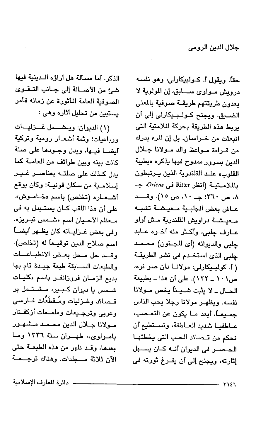 حقا. ويقول أ. كولبيكارلى، وهو نفسه درويش مولوى سابق، إن المولوية لا يعدون طريقتهم طريقة صوفية بالمعنى الضيق. ويجنح كولبيكارلى إلى أن يربط هذه الطريقة بحركة الملامتية التي انبعثت من خراسان. بل إن المرء يدرك من قراءة مواعظ والد مولانا جلال الدين بسرور ممدوح فيها يذكره "بطيبة القلوب " عند القلندرية الذين يرتبطون بالملامتية (انظر Ritter في Oriens جـ 8، ص 360؛ جـ 10، ص 15). وقد عاش بعض الجلبية معيشة تشبه معيشة دراويش القلندرية مثل أولو عارف جلبى، ولم كثر منه أخوه عابد جلبى والديوانه (أي المجنون) محمد جلبى الذي استخدم في نشر الطريقة (أ. كولبيكارلى: مولانا دان صو نره، ص 101 - 122). على أن هذا- بطبيعة الحال- لا يثبت شيئًا يخص مولانا نفسه. ويظهر مولانا رجلا يحب الناس جميعًا، أبعد ما يكون عن التعصب، عاطفيا شديد العاطفة، ونستطيع أن نحكم من قصائد الحب التي يخطئها الحصر في الديوان أنه كان يسهل إثارته، ويجنح إلى أن يفرغ ثورته في الذكر. أما مسألة هل أراؤه الدينية فيها شيء من الأصالة إلى جانب التقوى الصوفية العامة المأثورة عن زمانه فأمر يستبين من تحليل آثاره وهي: