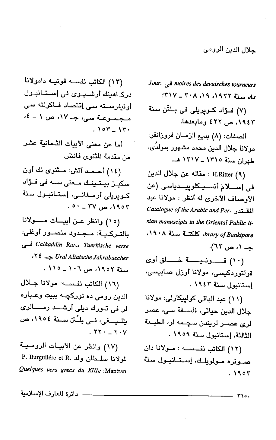 (16) الكاتب نفسه: مولانا جلال الدين رومى ده توركجه ببيت وعباره لر في تورك ديلى أرشد رمالرى يلليغى، في بلتّن سنة 1954، ص 207 - 220.