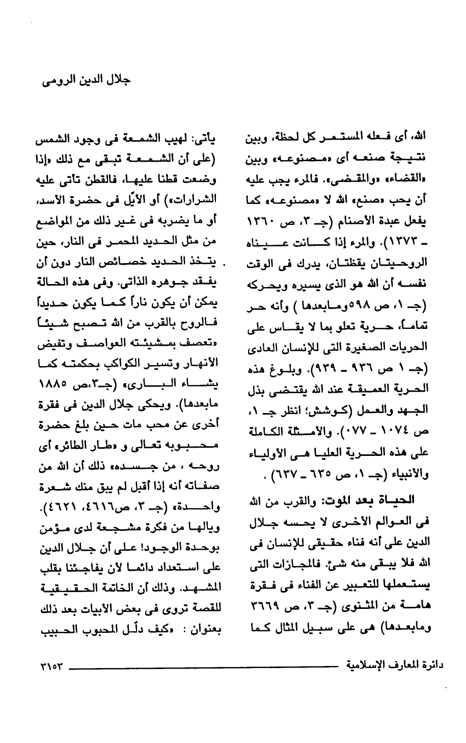 الله، أي فعله المستمر كل لحظة، وبين نتيجة صنعه أي "مصنوعه" وبين "القضاء" "والمقضى". فالمرء يجب عليه أن يحب "صنع" الله لا "مصنوعه " كما يفعل عبدة الأصنام (جـ 3، ص 1360 - 1373) المرء إذا كانت عيناه الروحيتان يقظتان، يدرك في الوقت نفسه أن الله هو الذي يسيره ويحركه (جـ 1، ص 598 وما بعدها) وأنه حر تمامًا، حرية تعلو بما لا يقاس على الحريات الصغيرة التي للإنسان العادى (جـ 1 ص 936 - 939). وبلوغ هذه الحرية العميقة عند الله يقتضي بذل الجهد والعمل (كوشش؛ انظرجـ 1، ص 1074 - 1077). والأمثلة الكاملة على هذه الحرية العليا هي الأولياء والأنبياء (جـ 1، ص 635 - 637).