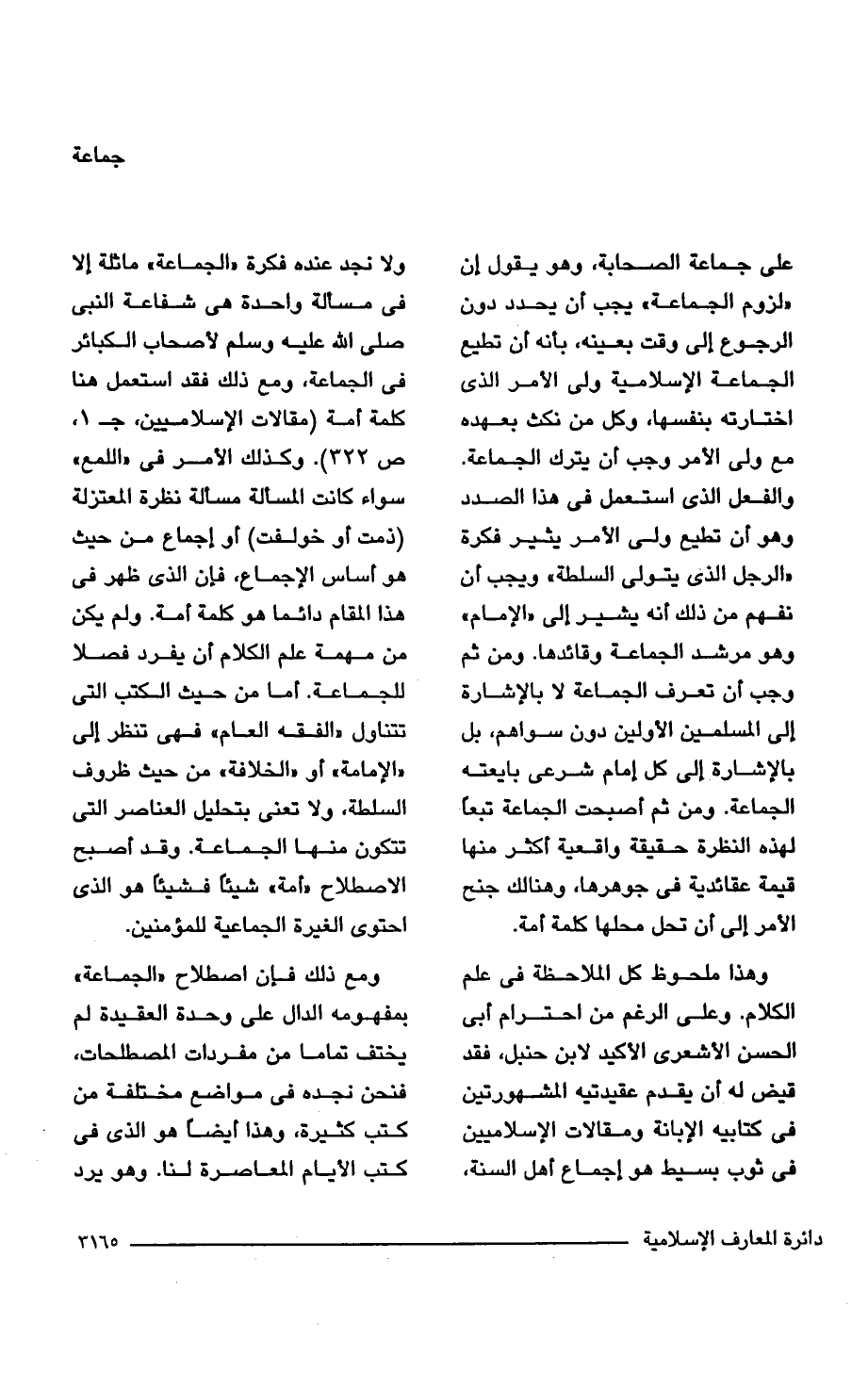 وهذا ملحوظ كل الملاحظة في علم الكلام. وعلى الرغم من احترام أبي الحسن الأشعرى الأكيد لابن حنبل، فقد قيض له أن يقدم عقيدتيه المشهورتين في كتابيه الإبانة ومقالات الإسلاميين في ثوب بسيط هو إجماع أهل السنة، ولا نجد عنده فكرة "الجماعة" ماثلة إلا في مسألة واحدة هي شفاعة النبي صلى الله عليه وسلم لأصحاب الكبائر في الجماعة، ومع ذلك فقد استعمل هنا كلمة أمة (مقالات الاسلاميين، جـ 1، ص 322). وكذلك الأمر في "اللمع " سواء كانت المسألة مسألة نظرة المعتزلة (ذمت أو خولفت) أو إجماع من حيث هو أساس الإجماع، فإن الذي ظهر في هذا المقام دائما هو كلمة أمة. ولم يكن من مهمة علم الكلام أن يفرد فصلًا للجماعة. أما من حيث الكتب التي تتناول "الفقه العام" فهي تنظر إلى "الإمامة" أو "الخلافة" من حيث ظروف السلطة، ولا تعنى بتحليل العناصر التي تتكون منها الجماعة. وقد أصبح الاصطلاح "أمة" شيئًا فشيئًا هو الذي احتوى الغيرة الجماعية للمؤمنين.