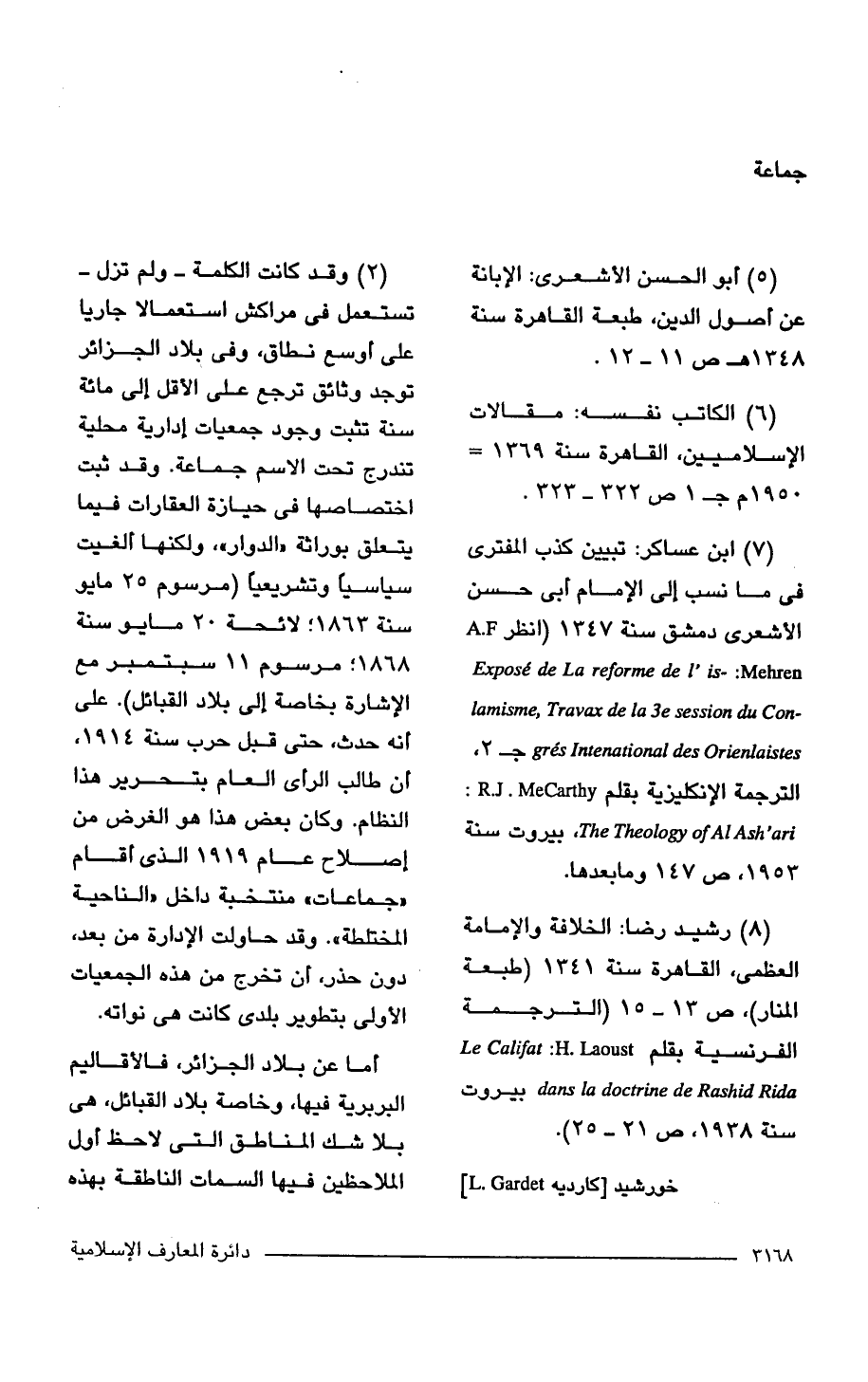 (2) وقد كانت الكلمة -ولم تزل- تستعمل في مراكش استعمالا جاريا على أوسع نطاق، وفي بلاد الجزائر توجد وثائق ترجع على الآقل إلى مائة سنة تثبت وجود جمعيات إدارية محلية تندرج تحت الاسم جماعة. وقد ثبت اختصاصها في حيازة العقارات فيما يتعلق بوراثة "الدوار"، ولكنها ألغيت سياسيًا وتشريعيًا (مرسوم 25 مايو سنة 1863؛ لائحة 20 مايو سنة 1868؛ مرسوم 11 سبتمبر مع الإشارة بخاصة إلى بلاد القبائل). على أنه حدث، حتى قبل حرب سنة 1914 أن طالب الراى العام بتحرير هذا النظام. وكان بعض هذا هو الغرض من إصلاح عام 1919 الذي أقام "جماعات" منتخبة داخل "الناحية المختلطة". وقد حاولت الإدارة من بعد، دون حذر، أن تخرج من هذه الجمعيات الأولى بتطوير بلدى كانت هي نواته.