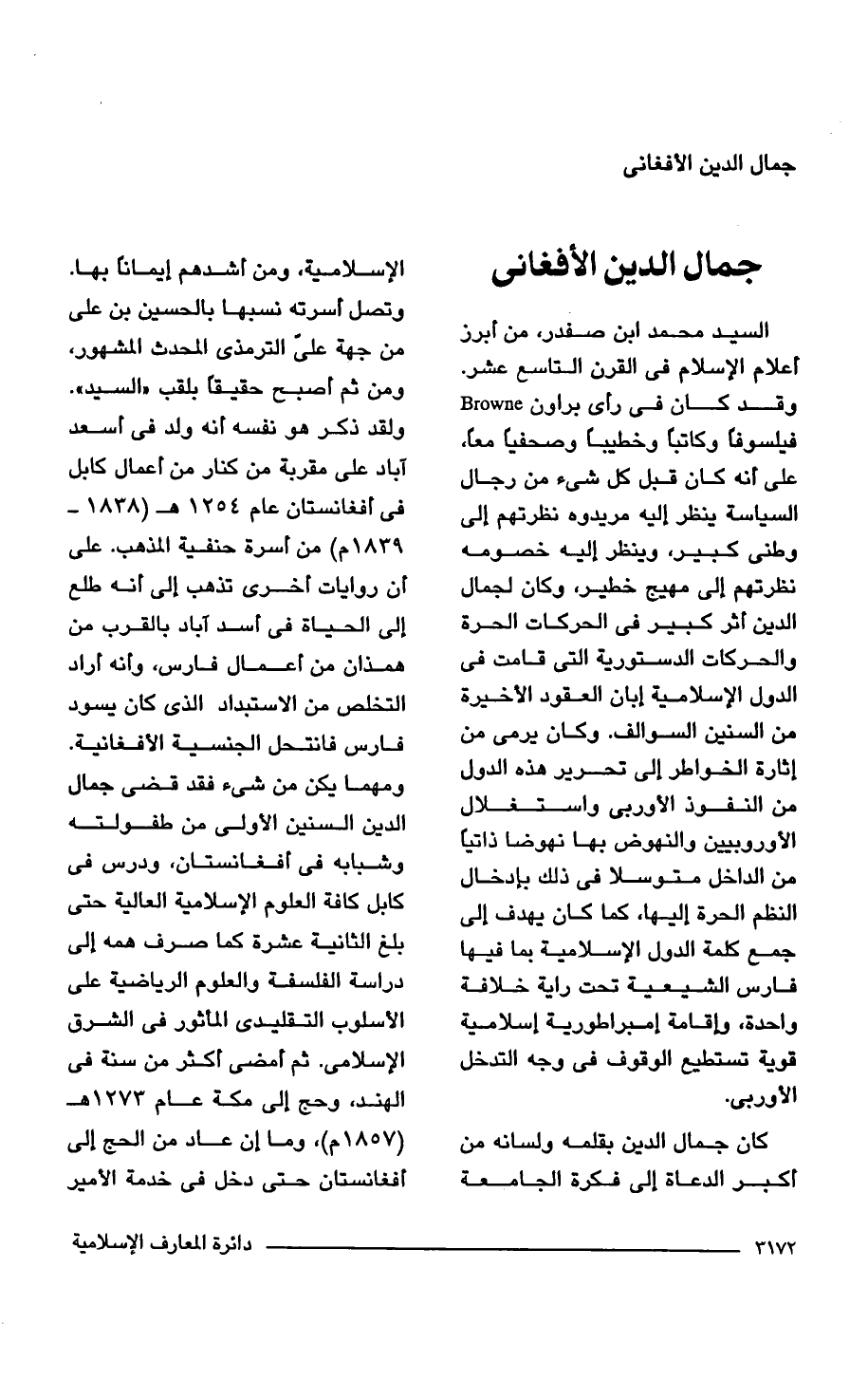 السيد محمد بن صفدر، من أبرز أعلام الإسلام في القرن التاسع عشر. وقد كان في رأى براون Browne فيلسوفًا وكاتبًا وخطيبًا وصحفيًا معًا، على أنه كان قبل كل شيء من رجال السياسة ينظر إليه مريدوه نظرتهم إلى وطنى كبير، وينظر إليه خصومه نظرتهم إلى مهيج خطير، وكان لجمال الدين أثر كبير في الحركات الحرة والحركات الدستورية التي قامت في الدول الإسلامية إبان العقود الأخيرة من السنين السوالف. وكان يرمى من إثارة الخواطر إلى تحرير هذه الدول من النفوذ الأوربى واستغلال الأوروبيين والنهوض بها نهوضا ذاتيًا من الداخل متوسلا في ذلك بإدخال النظم الحرة إليها، كما كان يهدف إلى جمع كلمة الدول الإسلامية بما فيها فارس الشيعية تحت راية خلافة واحدة، وإقامة إمبراطورية إسلامية قوية تستطيع الوقوف في وجه التدخل الأوربى.