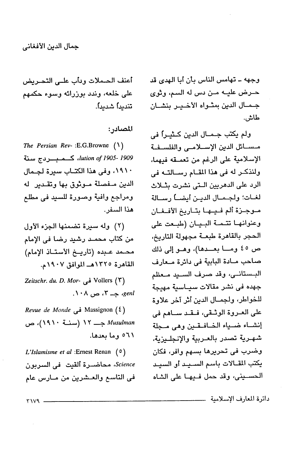 (1) The Persian Rev-: E.G.Browne lution of 1905 - 1909. كمبردج سنة 1910، وفي هذا الكتاب سيرة لجمال الدين مفصلة موثوق بها وتقدير له ومراجع وافية وصورة للسيد في مطلع هذا السفر.