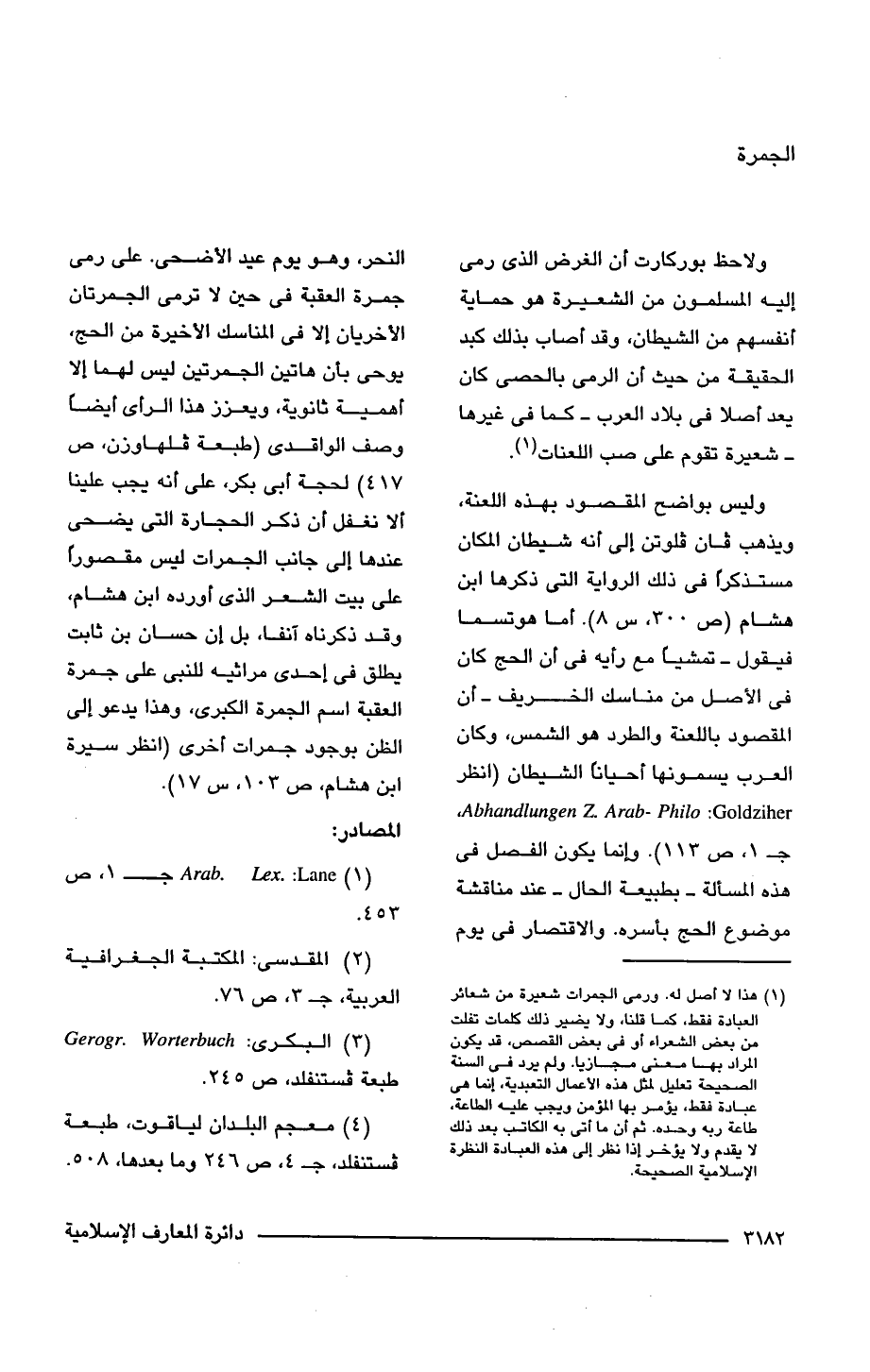 وليس بواضح المقصود بهذه اللعنة، ويذهب فإن فلوتن إلى أنه شيطان المكان مستذكرًا في ذلك الرواية التي ذكرها ابن هشام (ص 300، س 8) أما هوتسما فيقول- تمشيا مع رأيه في أن الحج كان في الأصل من مناسك الخريف- أن المقصود باللعنة والطرد هو الشمس، وكان العرب يسمونها أحيانا الشيطان (انظر Abhandlungen Z. Arab- Philo: Goldziher, ج 1، ص 113). وإنما يكون الفصل في هذه المسألة- بطبيعة الحال- عند مناقشة موضوع الحج بأسره. والاقتصار في يوم النحر، وهو يوم عيد الأضحى. على رمى جمرة العقبة في حين لا ترمى الجمرتان الأخريان إلا في المناسك الأخيرة من الحج، يوحى بأن هاتين الجمرتين ليس لهما إلا أهمية ثانوية، ويعزز هذا الرأى أيضًا وصف الواقدي (طبعة فلهاوزن، ص 417) لحجة أبي بكر، على أنه يجب علينا ألا نغفل أن ذكر الحجارة التي يضحى عندها إلى جانب الجمرات ليس مقصورًا على بيت الشعر الذي أورده ابن هشام، وقد ذكرناه آنفا، بل إن حسان بن ثابت يطلق في إحدى مراثيه للنبي على جمرة العقبة اسم الجمرة الكبرى، وهذا يدعو إلى الظن بوجود جمرات أخرى (انظر سيرة ابن هشام، ص 103، س 17.