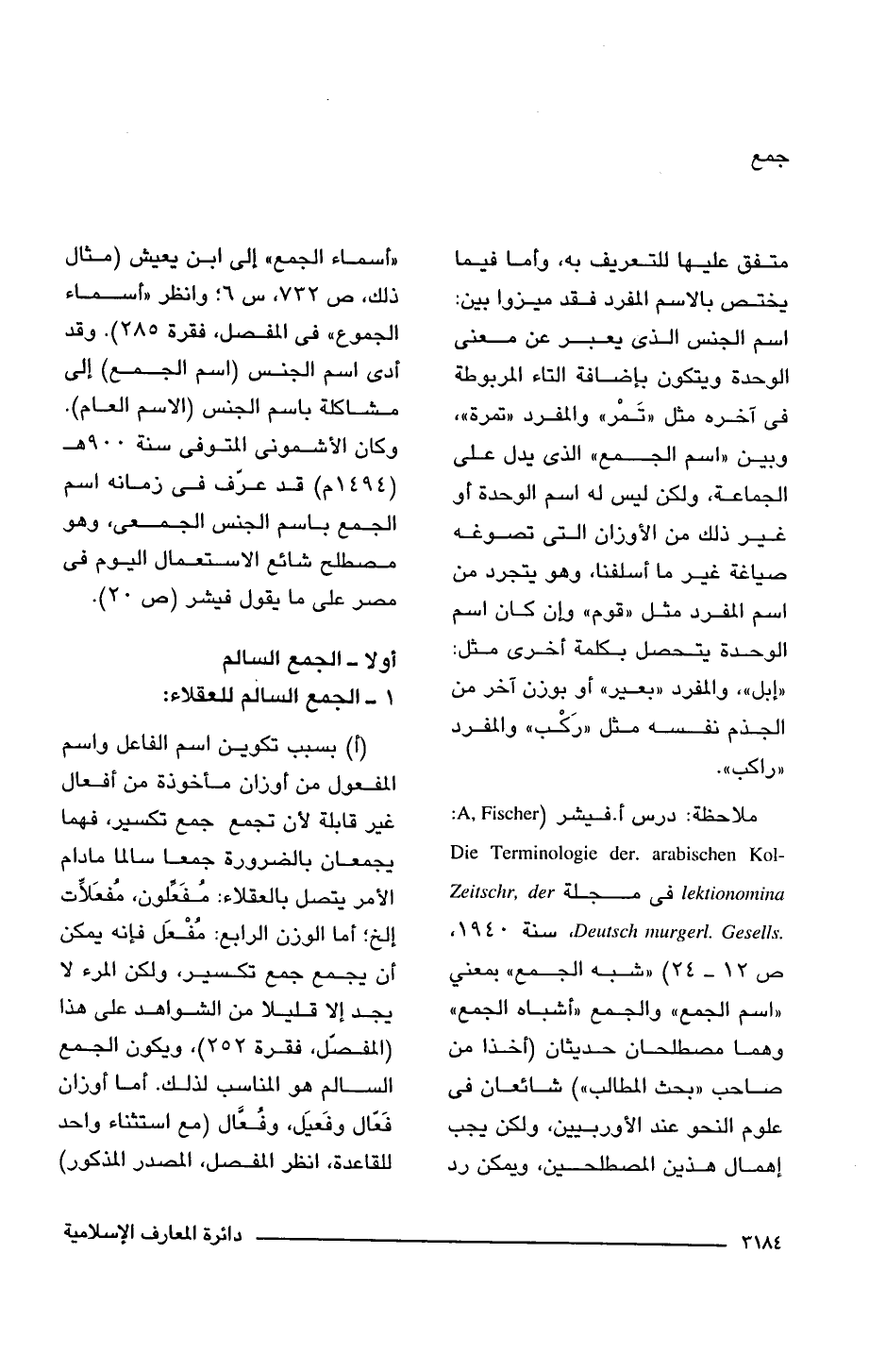 وكان الأشمونى المتوفى سنة 900 هـ (1494) قد عزف في زمانه اسم الجمع باسم الجنس الجمعى، وهو مصطلح شائع الاستعمال اليوم في مصر على ما يقول فيشر (ص 20).