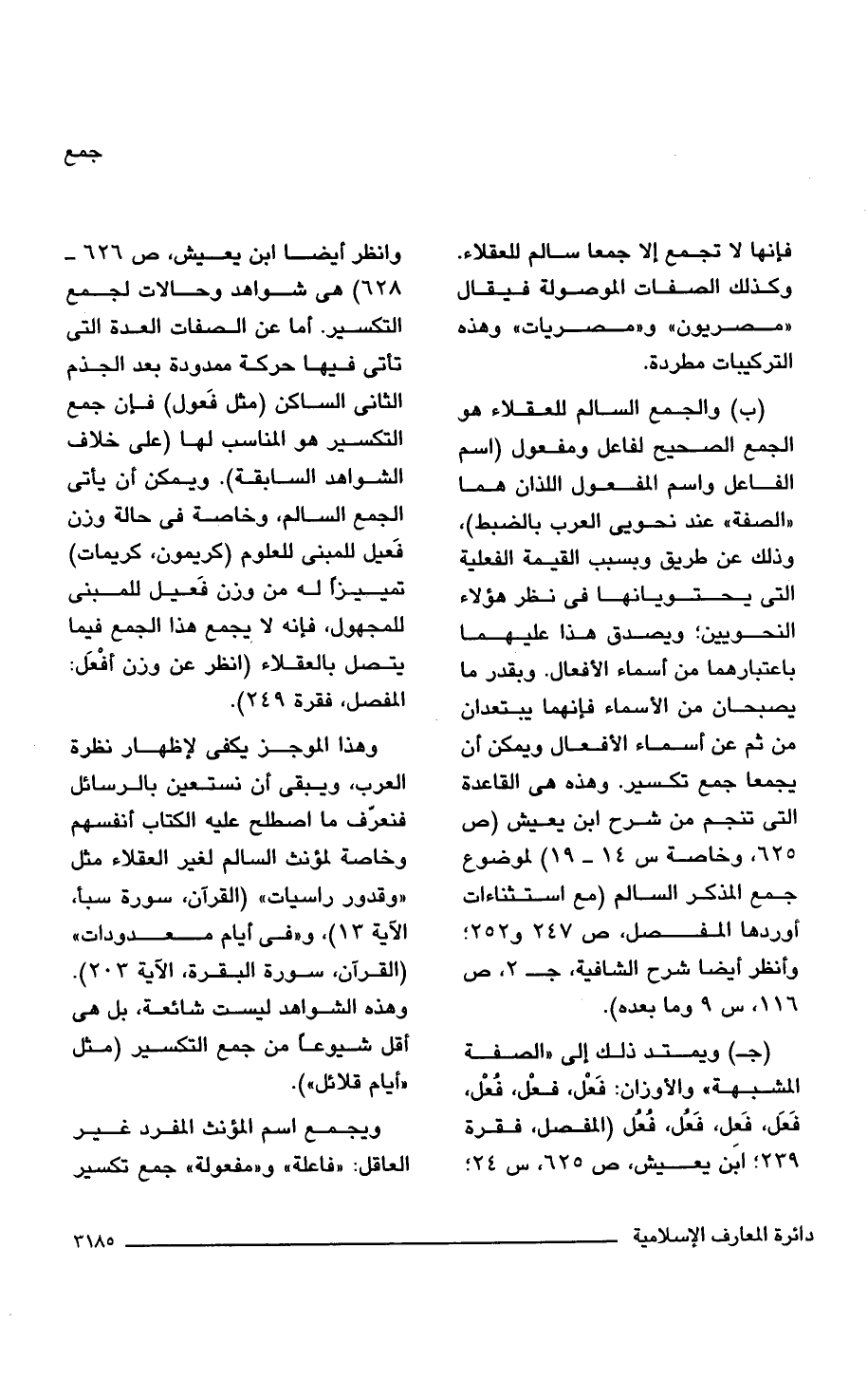 (بـ) والجمع السالم للعقلاء هو الجمع الصحيح لفاعل ومفعول (اسم الفاعل واسم المفعول اللذان هما "الصفة" عند نحويى العرب بالضبط)، وذلك عن طريق وبسبب القيمة الفعلية التي يحتويانها في نظر هؤلاء النحويين؛ ويصدق هذا عليهما باعتبارهما من أسماء الأفعال. وبقدر ما يصبحان من الأسماء فإنهما يبتعدان من ثم عن أسماء الأفعال ويمكن أن يجمعا جمع تكسير. وهذه هي القاعدة التي تنجم من شرح ابن يعيش (ص 625، وخاصة س 14 - 19) لموضوع جمع المذكر السالم (مع استثناءات أوردها المفصل، ص 247 و 252؛ وانظر أيضًا شرح الشافية، جـ 2، ص 116، س 9 وما بعده).