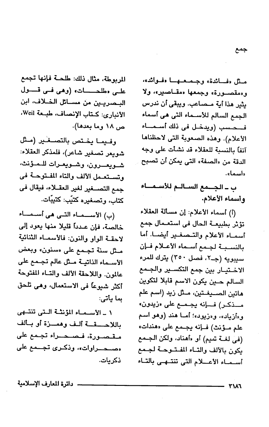 (أ) أسماء الأعلام: إن مسألة العقلاء تؤثر بطبيعة الحال في استعمال جمع أسماء الأعلام والتصغير أيضًا. أما بالنسبة لجمع أسماء الأعلام فإن سيبويه (جـ 3، فصل 350) يترك للمرء الاختيار بين جمع التكسير والجمع السالم حين يكون الاسم قابلا لتكوين هاتين الصيغتين، مثل زيد (اسم علم مذكر) فإنه يجمع على "زيدون" و"أزياد"، و"زيود"؛ أما هند (وهو اسم علم مؤنث) فإنه يجمع على "هندات" (في لغة تميم) أو "أهناد" ولكن الجمع يكون بالألف والتاء المفتوحة لجمع أسماء الأعلام التي تنتهي بالتاء المربوطة، مثال ذلك: طلحة فإنها تجمع على "طلحات" (وهي في قول البصريين من مسائل الخلاف، ابن الأنبارى: كتاب الإنصاف، طبعة Weil. ص 18 وما بعدها).