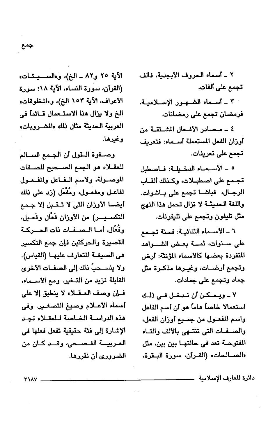 7 - ويمكن أن ندخل في ذلك استعمالا خاصًّا هامًا هو أن اسم الفاعل واسم المفعول من جميع أوزان الفعل، والصفات التي تنتهي بالألف والتاء المفتوحة تعد في حالتها بين بين، مثل "الصالحات" (القرآن، سورة البقرة، الآية 25 و 82 - الخ)، و"السيئات" (القرآن، سورة النساء، الآية 18؛ سورة الأعراف، الآية 153 الخ)، و"المخلوقات، الخ ولا يزال هذا الاستعمال قائمًا في العربية الحديئة مثال ذلك "المشروبات، وغيرها.