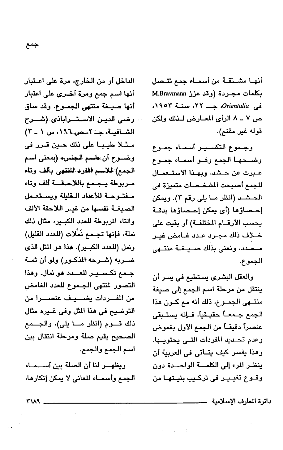 والعقل البشرى يستطيع في يسر أن ينتقل من مرحلة اسم الجمع إلى صيغة منتهى الجموع، ذلك أنه مع كون هذا الجمع جمعًا حقيقيًّا، فإنه يستبقى عنصرًا دقيقًا من الجمع الأول بغموض وعدم تحديد المفردات التي يحتويها. وهذا يفسر كيف يتأتى في العربية أن ينظر المرء إلى الكلمة الواحدة دون وقوع تغيير في تركيب بنيتها من الداخل أو من الخارج، مرة على اعتبار أنها اسم جمع ومرة أخرى على اعتبار أنها صيغة منتهى الجموع. وقد ساق رضي الدين الاستراباذى (شرح الشافية، ج 2، ص 196، س 1 - 3) مثلًا طيبا على ذلك حين قرر في وضوح) أن "ملسم الجنس" (بمعنى اسم الجمع) للاسم المفرد المنتهى بألف وتاء مربوطة يجمع باللاحقة) ألف وتاء مفتوحة للأعداد القليلة ويستعمل الصيغة نفسها من غير اللاحقة الألف والتاء المربوطة للعدد الكبير، مثال ذلك نملة، فإنها تجمع نَمْلات (للعدد القليل) ونمل (للعدد الكبير). هذا هو المثل الذي ضربه (شرحه المذكور) ولو أن ثمة جمع تكسير للعدد هو نمال. وهذا التصور لمنتهى الجموع للعدد الغامض من المفردات يضيف عنصرا من التوضيح في هذا المثل وفي غيره مثال ذلك قوم (انظر ما يلي)، والجمع الصحيح يقيم صلة ومرحلة انتقال بين اسم الجمع والجمع.