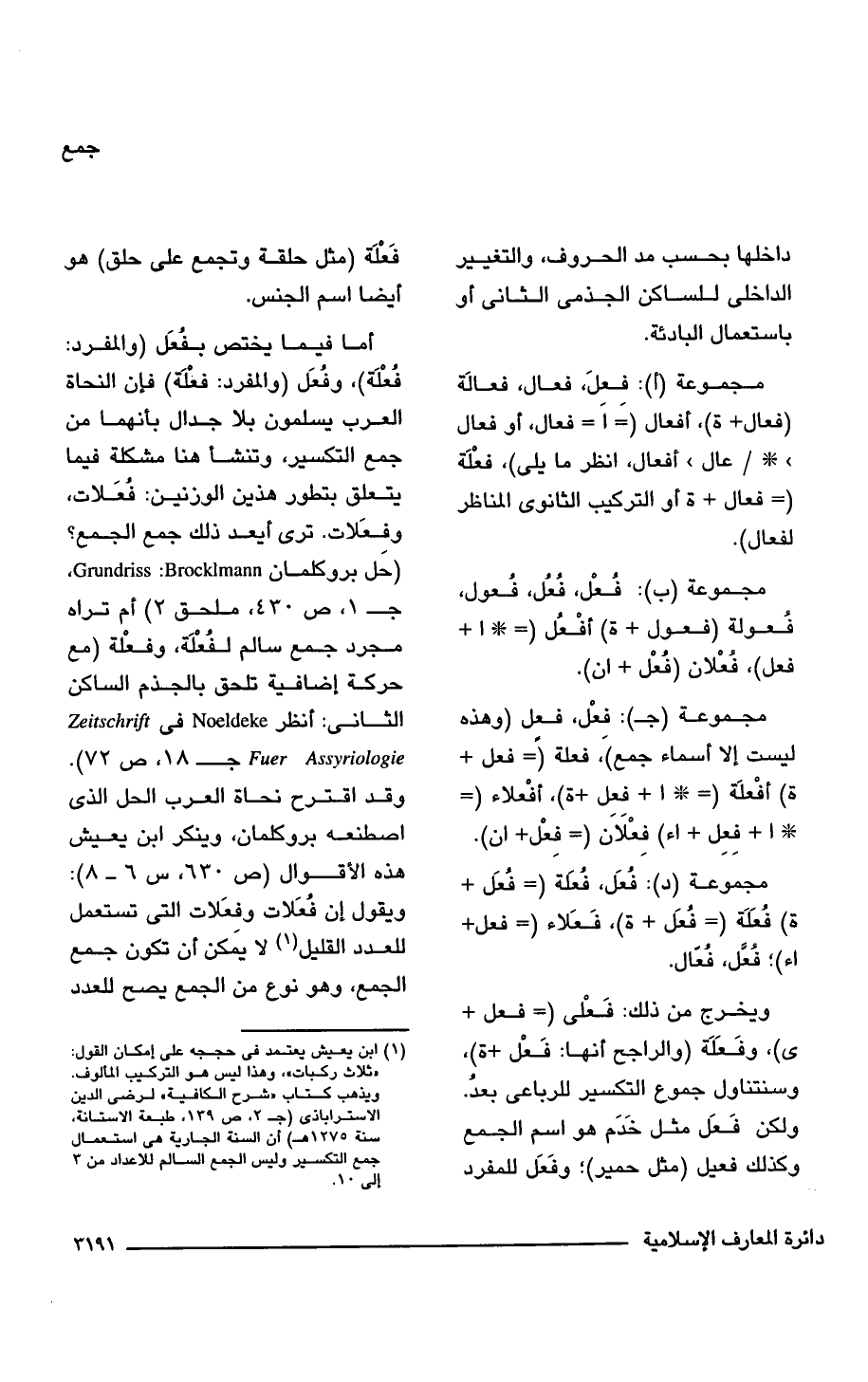 (¬1) ابن يعيش يعتمد في حججه على إمكان القول: "ثلاث ركبات"، وهذا ليس هو التركيب المالوف. ويذهب كتاب، شرح الكافية" لرضى الدين الاستراباذى (ج 2، ص 139، طبعة الاستانة، سنة 1275 هـ) أن السنة الجارية هي استعمال جمع التكسير وليس الجمع السالم للأعداد من 3 إلى 10.