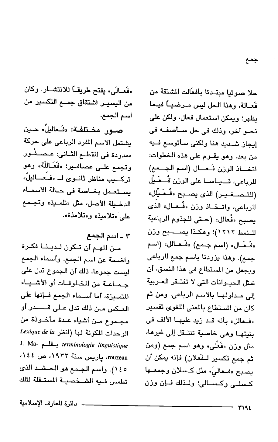 من المهم أن تكون لدينا فكرة واضحة عن اسم الجمع. وأسماء الجمع ليست جموعا، ذلك أن الجموع تدل على جماعة من المخلوقات أو الأشياء المتميزة، أما أسماء الجمع فإنها على العكس من ذلك تدل على قدر أو مجموع من أشياء عدة مأخوذة من الوحدات المكونة لها (انظر Lexique de la tenninologie linguislique بقلم - J. Ma rouzeau، باريس سنة 1933، ص 144، 145). واسم الجمع هو الحشد الذي تطمس فيه الشخصية المستقلة لتلك