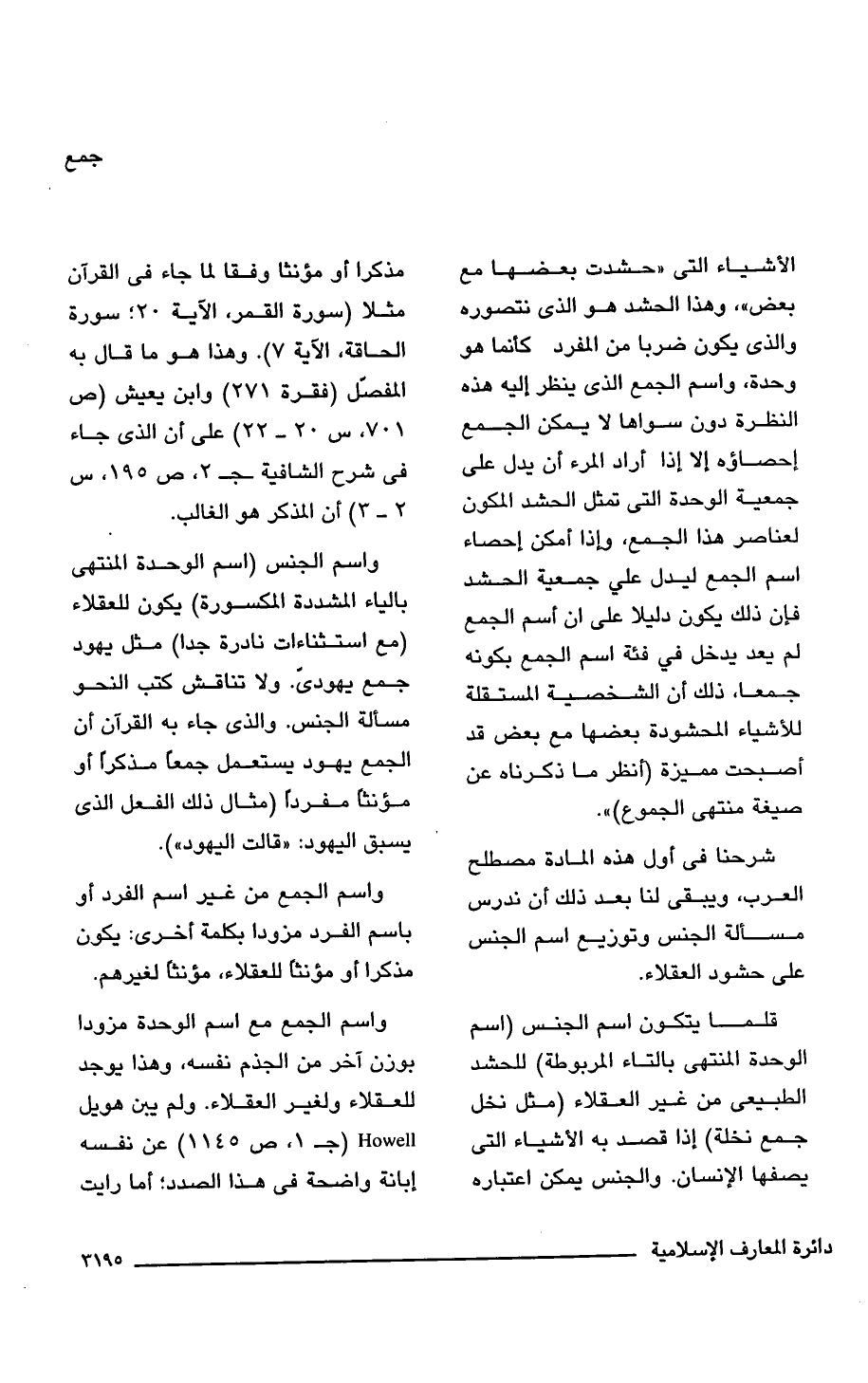 الأشياء التي "حشدت بعضها مع بعض" وهذا الحشد هو الذي نتصوره والذي يكون ضربا من المفرد كأنما هو وحدة، واسم الجمع الذي ينظر إليه هذه النظرة دون سواها لا يمكن الجمع إحصاؤه إلا إذا أراد المرء أن يدل على جمعية الموحدة التي تمثل الحشد المكون لعناصر هذا الجمع، وإذا أمكن إحصاء اسم الجمع ليدل علي جمعية الحشد فإن ذلك يكون دليلا على أن اسم الجمع لم يعد يدخل في فئة اسم الجمع بكونه جمعا، ذلك أن الشخصية المستقلة للأشياء المحشودة بعضها مع بعض قد أصبحت مميزة (انظر ما ذكرناه عن صيغة منتهى الجموع) ".