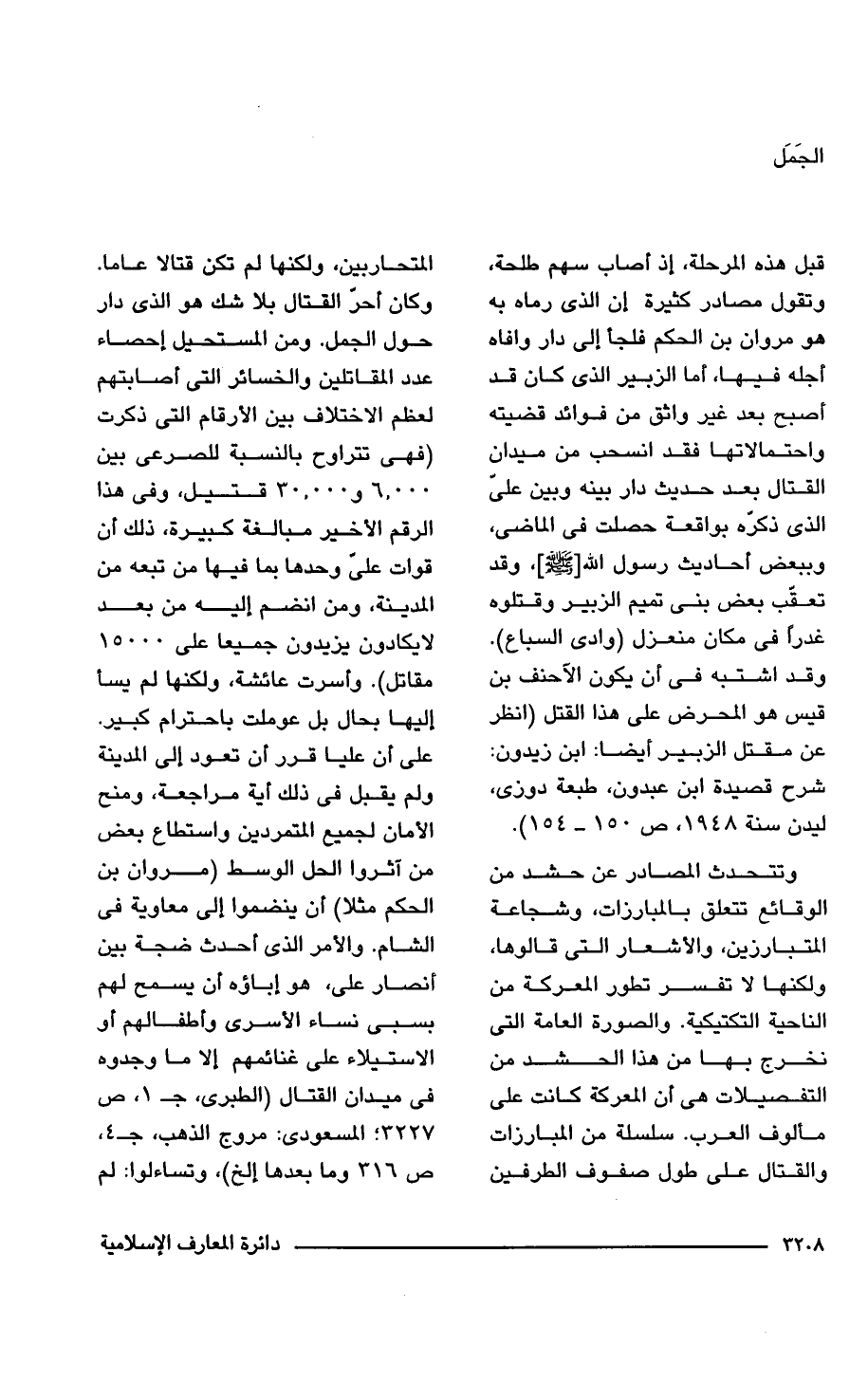 قبل هذه المرحلة، إذ أصاب سهم طلحة، وتقول مصادر كثيرة إن الذي رماه به هو مروان بن الحكم فلجأ إلى دار وافاه أجله فيها، أما الزبير الذي كان قد أصبح بعد غير واثق من فوائد قضيته واحتمالاتها فقد انسحب من ميدان القتال بعد حديث دار بينه وبين على الذي ذكره بواقعة حصلت في الماضي، وببعض أحاديث رسول الله [صلى الله عليه وسلم]، وقد تعقَّب بعض بنى تميم الزبير وقتلوه غدرًا، في مكان منعزل (وادي السباع). وقد اشتبه في أن يكون الأحنف بن قيس هو المحرض على هذا القتل (انظر عن مقتل الزبير أيضًا: ابن زيدون: شرح قصيدة ابن عبدون، طبعة دوزى، ليدن سنة 1948، ص 150 - 154).