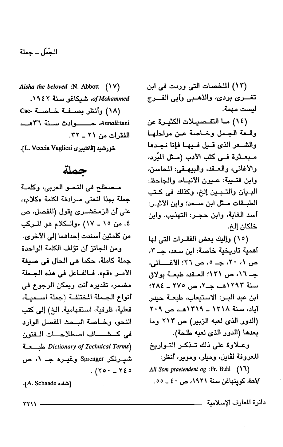 مصطلح في النحو العوبرى، وكلمة جملة بهذا المعنى مرادفة لكلمة "كلام"، على أن الزمخشرى يقول (المفصل، ص 4، من 15 - 17) الكلام هو المركب من كلمتين) سندت إحداهما إلى الأخرى. ومن الجائز أن تؤلف الكلمة الواحدة جملة كاملة، حكما هي الحال في صيغة الأمر "قم". فالفاعل في هذه الجملة مضمر، تقديره أنت ويمكن الرجوع في أنواع الجملة المختلفة (جمله اسمية، فعلية، ظرفية، استفهامية. الخ) إلى كتب النحو، وخاصة البحث المفصل الوارد في كشاف اصطلاحات، الفنون Dictionary of Technical Terms) طبعة شبونكر Sprenger وغيره ج 1، ص 245 - 250)