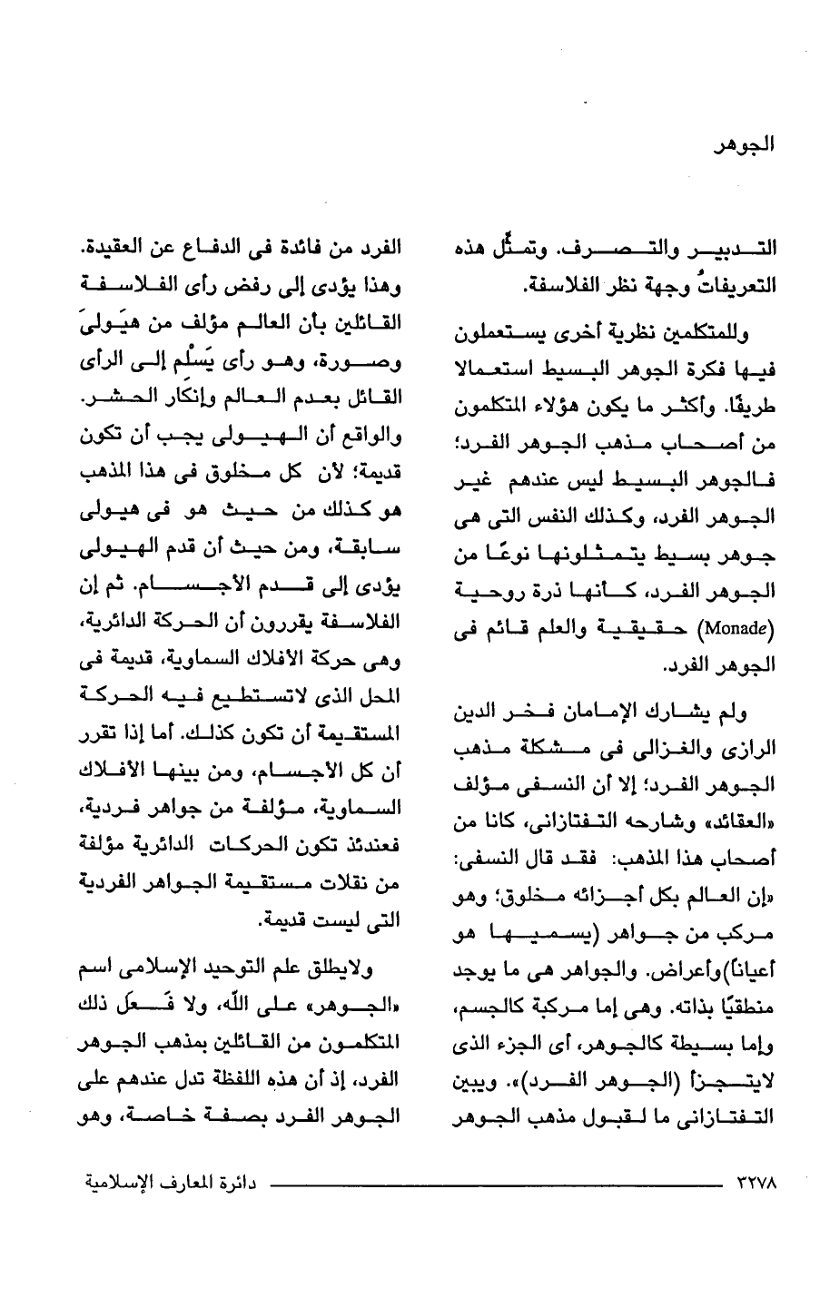 ولم يشارك الإمامان فخر الدين الرازي والغزالى في مشكلة مذهب الجوهر الفرد؛ إلا أن النسفى مؤلف "العقائد" وشارحه التفتازانى، كانا من أصحاب هذا المذهب: فقد قال النسفى: "إن العالم بكل أجزائه مخلوق؛ وهو مركب من جواهر (يسميها هو أعيانًا) وأعراض. والجواهر هي ما يوجد منطقيًا بذاته. وهي إما مركبة كالجسم، وإما بسيطة كالجوهر، أي الجزء الذي لايتجزأ (الجوهر الفرد) ". ويبين التفتازانى ما لقبول مذهب الجوهر الفرد من فائدة في الدفاع عن العقيدة. وهذا يؤدى إلى رفض رأى الفلاسفة القائلين بأن العالم مؤلف من هيَولىَ وصورة، وهو رأى يَسْلم إلى الرأى القائل بعدم العالم وإنكَار الحشر. والواقع أن الهيولى يجب أن تكون قديمة؛ لأن كل مخلوق في هذا المذهب هو كذلك من حيث هو في هيولى سابقة، ومن حيث أن قدم الهيولى يؤدى إلى قدم الأجسام. ثم إن الفلاسفة يقررون أن الحركة الدائرية، وهي حركة الأفلاك السماوية، قديمة في المحل الذي لاتستطيع فيه الحركة المستقيمة أن تكون كذلك. أما إذا تقرر أن كل الأجسام، ومن بينها الأفلاك السماوية، مؤلفة من جواهر فردية، فعندئذ تكون الحركات الدائرية مؤلفة من نقلات مستقيمة الجواهر الفردية التي ليست قديمة.
